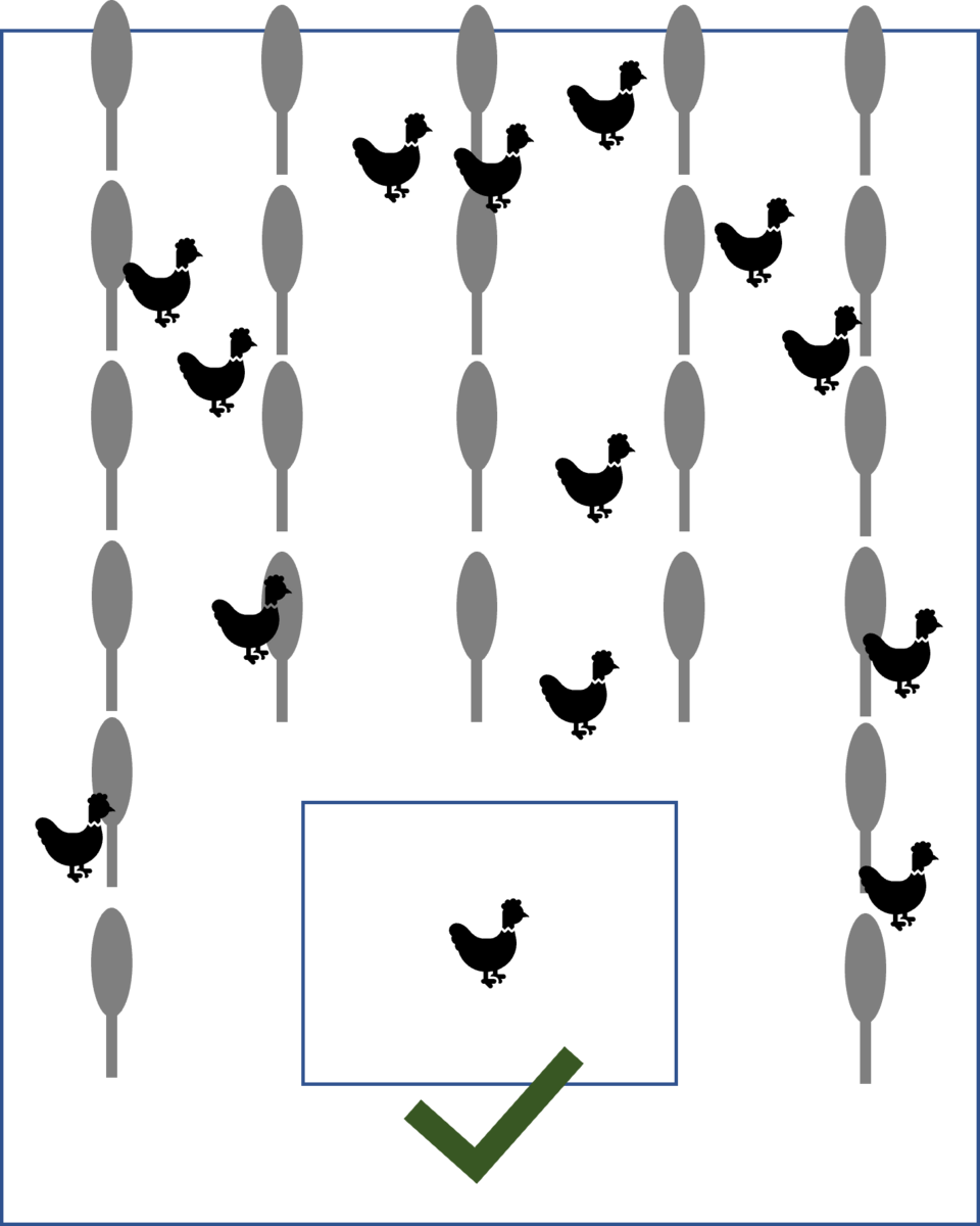 Die längs zum Stall verlaufenden Baumreihen wurden so nah wie möglich an den Mobilstall gepflanzt, damit sich möglichst viele Hennen hinein trauen. Quer angelegte Gehölzstreifen würden die Vögel schon an der ersten Reihe davon abbringen, sich weiter auf der Fläche zu verteilen. So aber nutzen die Tiere die Fläche optimal aus und verteilen ihre Hinterlassenschaften auf der gesamten Parzelle, wo die Bäume die Nährstoffe aufnehmen und auf diese Weise ihre Auswaschung verhindern. Das ist vor allem angesichts der häufig nitratbelasteten Böden in Hühnerausläufen sinnvoll. Mit der Ernte der KUP, verlassen diese Nährstoffe dann in Form von Hackschnitzeln den Betrieb.