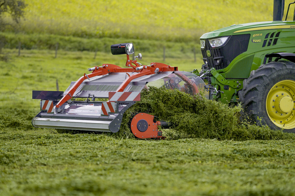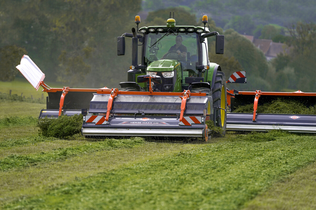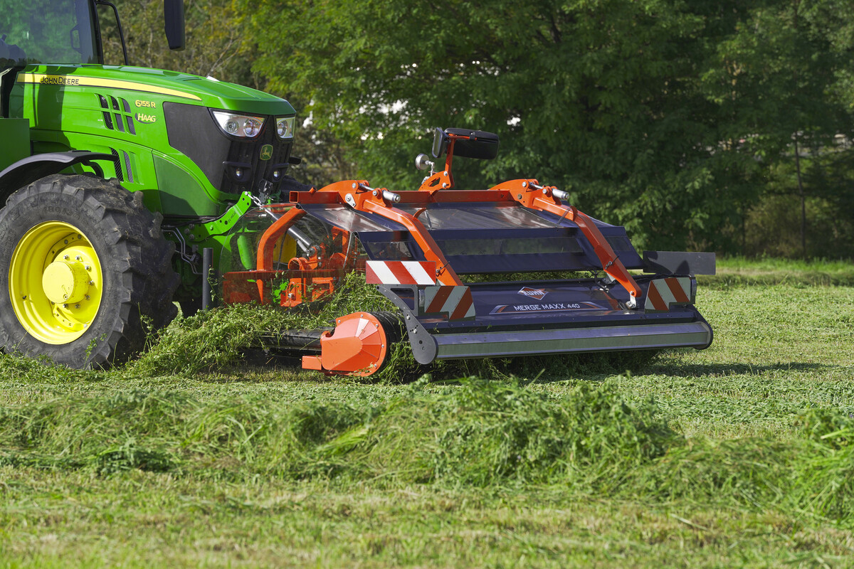 Der Merge Maxx 440 F von Kuhn ist ein neuer Bandschwader im Frontanbau. Diese Maschine wurde vor allem im Hinblick auf eine geringe Futterverschmutzung, das Entfallen des Überfahrens von Futter mit den Traktorrädern und dem effizienten Einsatz der nachfolgenden Erntemaschinen entwickelt.