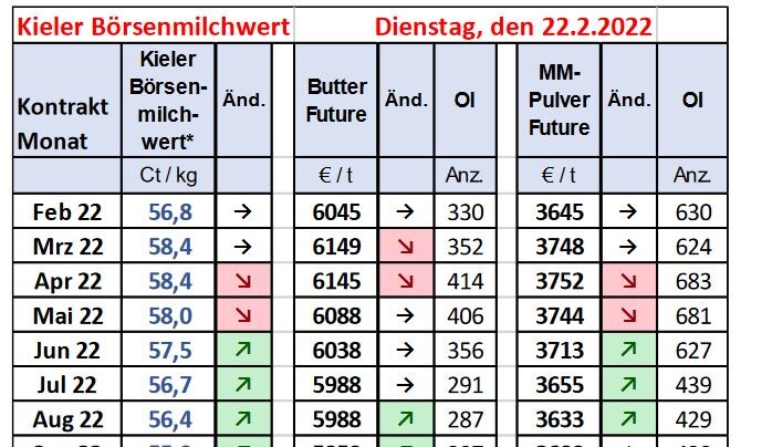 Im Februar 2022 erhöhte sich der aus den Marktpreisen für Butter und Magermilchpulver ermittelte Kieler Rohstoffwert Milch des ife Instituts für Ernährungswirtschaft Kiel um 2,0 Cent oder 3,7 Prozent auf 56,3 Cent je kg Milch.