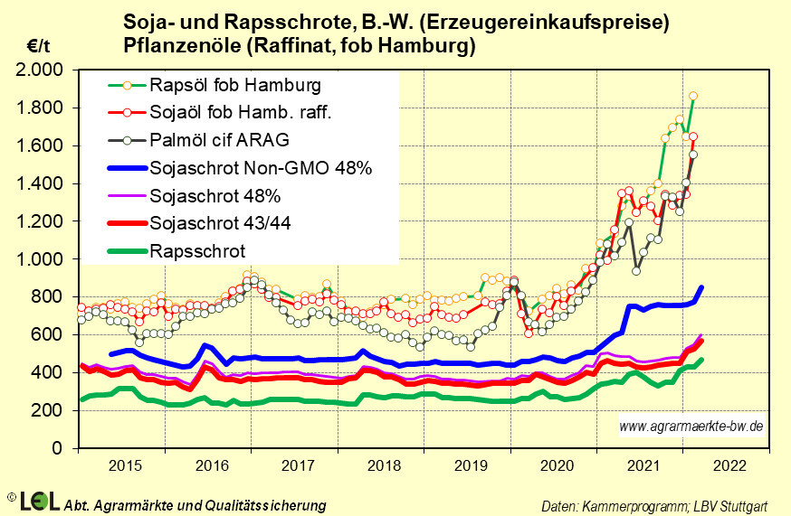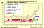 Bei Sonnenblumen hingegen ist die Region das Schwergewicht schlechthin. Mit 33 Mio.t werden hier knapp 60 Prozent der Welt-Sonnenblumenernte eingefahren. Soja und Raps gehen vorwiegend als Saat in den Export. Sonnenblumen hingegen werden vor Ort verarbeitet und als Sonnenblumenöl (ca. 16 Mio.t; 60 Prozent der Welterzeugung) und –schrot exportiert. Insofern ist es kaum verwunderlich, dass vor allem die bereits auf hohem Niveau befindlichen Pflanzenölpreise nochmals explosionsartig anstiegen.