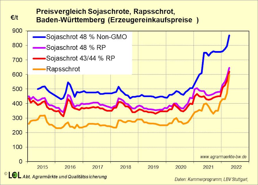 Die Sojaschrotpreise bewegen sich derzeit aufgrund des Angebots an Bohnen aus der neuen Ernte in Südamerika eher seitwärts, verharren aber auf hohem Niveau. Gekauft wird nur für den vorderen Bedarf. Bei Importware wirkt zudem der schwache Euro als Preistreiber. Rapsschrot hingegen ist kaum noch ausreichend verfügbar. Im April wurde ein Erzeugereinkaufspreis für 43/44 er Sojaschrot bei 62 Euro/dt für Baden-Württemberg genannt. 48er HP-Schrot, welcher zu Jahresbeginn um 50 Euro/dt gelegen hatte, wurde im April bei 64,50 Euro/dt gesehen. Weiter außergewöhnlich teuer ist GVO-freier Schrot. Dieser kostete im April 87 Euro/dt. Für Rapsschrot wurde ein Preis bei 59,50 Euro/dt genannt. Und echte Entspannung scheint für vordere Ware kaum in Sicht zu sein.