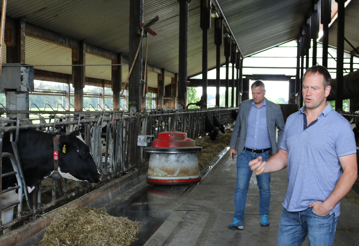 Der Gastgeber des Hofgespräches, Landwirt Edgar Müller (47), bewirtschaftet 60 Hektar (ha) Grünland, darunter 7,0 ha Flächen mit Pflegeverträgen und Feuchtwiesen sowie 2,0 ha Weideflächen. Zum Betrieb gehören 17 ha Ackerflächen mit Silomais sowie 2,5 ha Kleegras und 1,0 ha mehrjährige Blühmischung. Auf dem ausgesiedelten Betrieb, Baujahr 1998, stehen rund 100 Milchkühe, Schwarzbunte, mit Schnitt 10.000 bis 11.000 kg Jahresleistung. Gemolken wird mit zwei Robotern und das Jungvieh wird vornehmlich zugekauft. Großzügig erweitert in Richtung mehr Tierwohl wurde der Laufstall mit Liegeboxen und Schieberentmistung zuletzt vor rund sechs Jahren.
