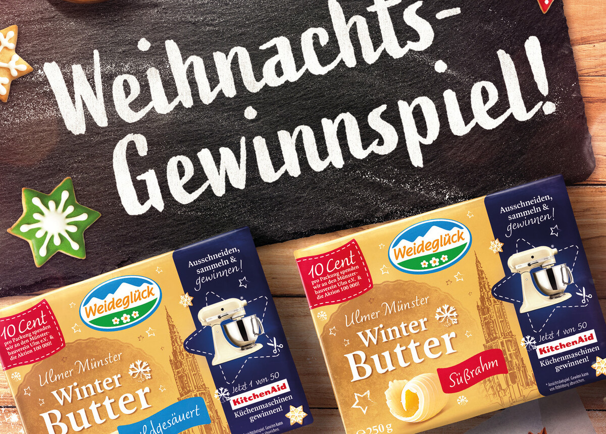 Die beliebte Weideglück Ulmer Münster Winterbutter ist von November bis Dezember 2022 wieder im Handel verfügbar. Zur guten Tradition gehört, dass die Milchwerke Schwaben für ihre Weideglück Winterbutter ein attraktives Gewinnspiel mit Spendenaktion organisiert haben, bei dem es in diesem Jahr Küchenmaschinen der Marke KitchenAid zu gewinnen gibt.