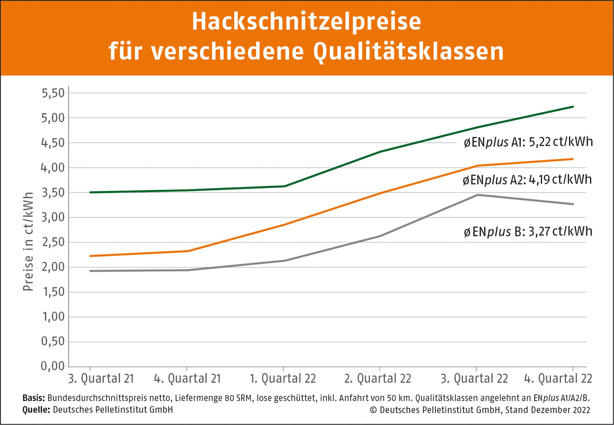 Das Deutsche Pelletinstitut erhebt die Preise für Hackschnitzel quartalsweise. Sie bezeichnen den Durchschnittspreis (netto) in Deutschland für einen Schüttraummeter der jeweiligen Qualitätsklasse. Qualitätsklasse A1 ist angelehnt an die Qualitätsklasse ENplus A1, Qualitätsklasse A2 ist angelehnt an die Qualitätsklasse ENplus A2. Qualitätsklasse B entspricht der Qualitätsklasse ENplus B. Die Qualitäten unterscheiden sich von A nach B nach zunehmenden Gehalten von Wasser, Asche und Feinanteilen.