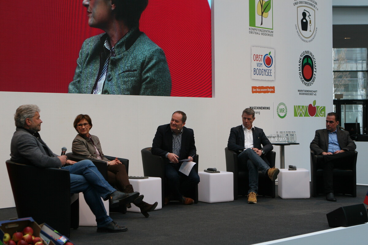 In einer Podiumsdiskussion zum Thema „Zwischen Systemrelevanz und Kostenexplosion – Obstbau in unsicheren Zeiten“ diskutierten unter der Leitung von Manfred Ehrle Staatssekretärin Sabine Kurtz vom baden-württembergischen Landwirtschaftsministerium, Thomas Heilig, der Vorsitzende der Obstregion Bodensee, Nico Grundler, der Geschäftsführer vom Obstgroßmarkt Grundler und der Obst vom Bodensee Vertriebsgesellschaft sowie Anthony Lee, Sprecher von Landwirtschaft verbindet Deutschland über Ansatzpunkte zur Lösung der Marktprobleme.