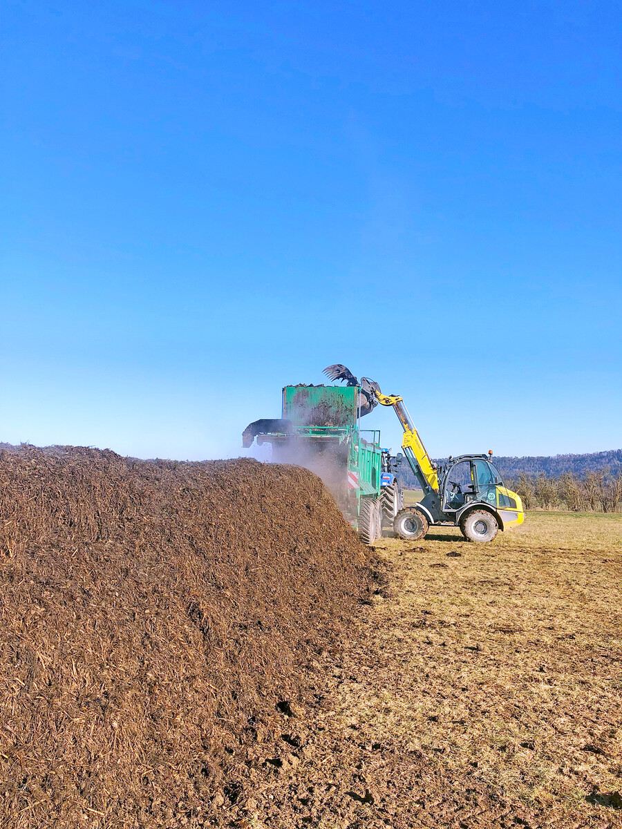 „Wesentlich ist bei uns die Kompostierung von Stallmist“, sagte Kraul. Auf dem Unteren Berghof wird die reduktive Kompostierung umgesetzt, die auch als mikrobielle Carbonisierung bekannt ist. Dabei wird kein Heißrotteprozess mit ständigem Wenden des Komposts durchgeführt, da dieser Vorgang mit hohen Nährstoffverlusten verbunden sein kann.