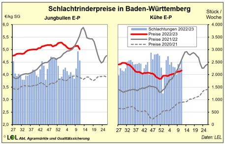 In KW 9 und 10 gab es durchaus noch Bedarf an Jungbullen seitens der Schlachthöfe, doch weil viele Landwirte auf steigende Preise vor Ostern spekuliert haben, wurden Schlachttiere bewusst zurückgehalten. Da die Preise aber entgegen den Erwartungen zuletzt gesunken sind und sich eine weiter negative Preistendenz abzeichnet, wollen viele Landwirte ihre Tiere jetzt noch schnellstmöglich loswerden. Die erhöhten Ablieferungsmengen überfordern jedoch derzeit die Aufnahmefähigkeit des Marktes. Wegen der gestiegenen Lebenshaltungskosten ist die Nachfrage der Verbraucher nach Rindfleisch seit Monaten sehr verhalten. Selbst vor Ostern deuten sich keinerlei Impulse im Fleischhandel an. Der Lebensmitteleinzelhandel ordert daher nur noch sehr vorsichtig.
