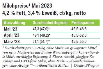 Der BWagrar Milchpreis für konventionelle Milch ist im Mai gegenüber dem April gewichtet um 1,8 Cent (2,2 Cent arithmetisch) auf durchschnittlich 47,3 Cent pro kg (47,0 Cent) nochmals weiter zurückgegangen. Der Biopreis fällt um 0,25 Cent (gewichtet) beziehungsweise um 0,6 Cent (arithmetisch) auf 56 Cent beziehungsweise 56,8 Cent. Damit hielten am Milchmarkt die Preissenkungen beim Milchgeld für die Betriebe im Mai weiter an.