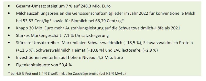Dieses primär durch Preiserhöhungen erzielte deutliche Umsatzwachstum war laut Pressemitteilung der Schwarzwaldmilch auch zwingend nötig. So wurden durch die gestiegenen Milchauszahlungspreise im Vergleich zum Jahr 2021 fast 30 Mio. Euro zusätzlich auf die Schwarzwaldmilch-Höfe gebracht und zudem musste ein Kostenanstieg (ohne Milchgeldauszahlung) auf Molkereiebene in knapp zweistelliger Millionenhöhe kompensiert werden. Diese Zahlen verdeutlichen, unter welchem massiven Markt- und Leistungsdruck die Schwarzwaldmilch-Gruppe im Jahr 2022 stand und aktuell weiterhin steht. Der Milchauszahlungspreis lag im Jahr 2022 für konventionelle Milch brutto mit 9,5 Prozent Mehrwertsteuer bei 53,53 Cent/kg (4,0 Prozent Fett und 3,4 Eiweiß inkl. aller Zuschläge). Netto sind das 48,89 Cent/kg. Für Biomilch waren es 66,79 Cent/kg bei 4,0 Prozent Fett und 3,4 Prozent Eiweiß inkl. aller Zuschläge brutto (netto: 61,00 Cent).