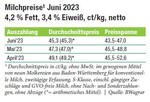 Wie schon im April und im Mai ist der BWagrar Milchpreis im Juni nochmals um zwei Cent gefallen auf nun 45,3 Cent pro kg. Der BWagrar Biomilchpreis blieb im Juni unverändert bei rund 56,0 Cent pro kg Milch. Der Kieler Rohstoffwert erhöhte sich im Juni um 0,6 Cent pro kg auf 37,0 Cent pro kg. Das könnte ein erstes Zeichen sein, dass der Preisrückgang bei der Milch bald gestoppt wird.