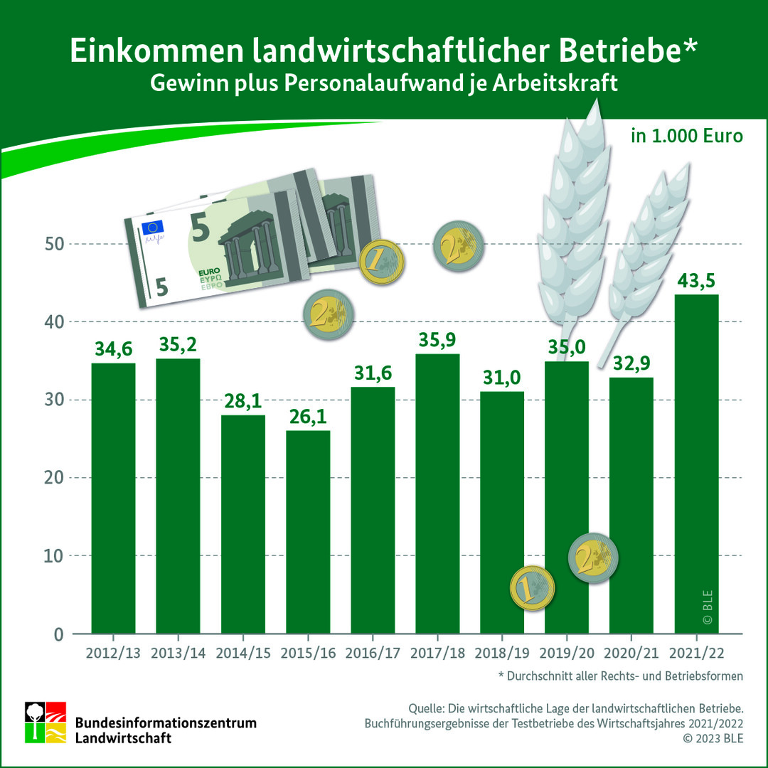 Das durchschnittliche Einkommen deutscher Landwirtinnen und Landwirte lag im Wirtschaftsjahr 2021/2022 bei rund 43.500 Euro pro Arbeitskraft, angegeben als Gewinn plus Personalaufwand. Das zeigen aktuelle Buchführungsanalysen des Testbetriebsnetzes Landwirtschaft des Bundesministeriums für Ernährung und Landwirtschaft (BMEL).