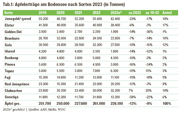 Die deutsche Apfelernte wird mit 0,95 Mio. t und elf Prozent weniger als im Vorjahr wieder unter der Eine-Million-Tonnen-Grenze liegen. Am Bodensee erwartet man eine im Vergleich zum Vorjahr um 13 Prozent geringere und im langjährigen Schnitt schlechtere Ernte als etwa 2021 oder 2016. Betroffen sind vor allem Jonagold und Idared, die preislich zuletzt nicht mehr überzeugen konnten. Erfreulich ist der geringere Rückgang bei Elstar und der Zuwachs an Clubsorten.