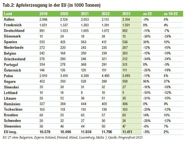 In der Europäischen Union liegt die Ernte mit 11,4 Mio. t nach 11,8 Mio. Tonnen 2022 erneut knapp unter den guten Ernten der beiden Vorjahre. Der Rückgang ist insbesondere auf eine um 10 Prozent beziehungsweise 500.000 Tonnen (t) verringerte Ernte in Polen zurückzuführen, während die in 2022 trockenen Länder Frankreich mit 1,47 Mio. t, Spanien 0,53 Mio. t und Ungarn 0,55 Mio. t auf Durchschnittsniveau zulegen. Italien hat mit 2,1 Mio. t eine normale Ernte wie im Vorjahr. Österreich, Tschechien, Belgien und die Niederlande verschlechtern sich dagegen deutlich.Mit Blick auf die Erntemengen einzelner Sorten zeigen die Hauptsorten Golden Delicious einen Zuwachs um 12 Prozent auf 2,17 Mio. t beziehungsweise Gala mit 1,52 Mio. t eine Rekordmenge. Weiter im rückläufigen Trend sind Jonagold/Jonagored mit 0,53 Mio. t und vor allem östliche Idared, immer noch mit 0,6 Mio.t, sowie Red Jonaprince mit 0,49 Mio. t. Elstar wird es deutlich weniger geben, seit langem unter 0,3 Mio. t. Die bei deutschen Konsumenten beliebte, aber im Anbau schwierige Sorte, scheint an Bedeutung zu verlieren. Mit guten Qualitäten sollten dieses Jahr deutlich stabilere Preise zu erzielen sein. Braeburn (0,2 Mio. t) und Fuji (0,31) werden wie im vergangenen Jahr knapper verfügbar sein, Pinova (0,2 Mio. t) bleiben konstant. Der Wechsel zu neuen Sorten, insbesondere Clubsorten, setzt sich mit 0,59 Mio. t weiter fort, dominant mit 0,23 Mio. t bleiben Pink Lady, gefolgt von Kanzi, Jazz, Ambrosia und Envy. Eine Reihe weiterer interessanter Clubsorten sind im Aufwind. Die Südtiroler Versuchsstation Laimburg hat 69 Logos von Sorten festgestellt. Nicht alle werden sich durchsetzen, aber ohne wird es auch nicht gehen. Die Preise und Erzeugererlöse bei diesen Sorten waren in den vergangenen Jahren deutlich höher.