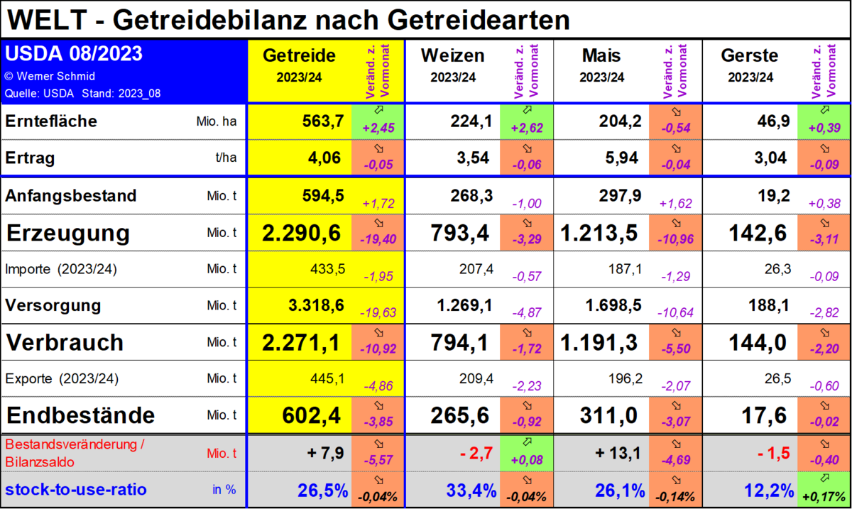 Vor allem die Trockenheit in den USA und in der EU-27 in der Aufwuchs- und Erntephase macht sich nun in den Zahlen bemerkbar. Aber Achtung: Auch nach den Augustzahlen präsentiert sich die Welt-Getreidebilanz 2023/24 noch immer als die größte aller Zeiten, und das Ergebnis ist unverändert positiv. Der erwartete Bestandsaufbau fällt mit plus 7,9 Mio.t (Endbestand 602,4 Mio.t) lediglich etwas kleiner aus als man im Juli erwartet hatte.