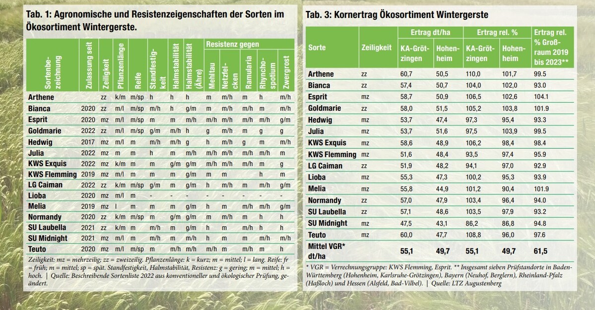 Im Jahr 2023 wurden 18 Sorten geprüft, davon sechs zweizeilige, neun mehrzeilige und drei Wertprüfungsstämme. Sechs Sorten waren zum ersten Mal im Sortiment. Bei der Sortenwahl ist neben dem Ertrag, dem Marktwareanteil und dem Hektolitergewicht auch die Gesundheit wichtig. Ein besonderes Augenmerk liegt auf der Anfälligkeit gegenüber dem Blattbefall mit Ramularia collo-cygni, ein Pilz, der zunehmend bedeutsam wird und dieses Jahr früh und verstärkt auftrat. Die Neigung zu Halmknicken, wie besonders in Grötzingen beobachtet, kann den Ertrag empfindlich reduzieren und sollte bei der Sortenwahl, gerade auf wüchsigen Standorten, beachtet werden.