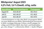 Im Monat August 2023 ist der BWagrar Milchpreis für konventionelle Milch mit minus 0,7 Cent gegenüber Juli auf durchschnittlich 43,6 Cent pro kg Milch erstmals in diesem Jahr nicht mehr ganz so stark zurückgegangen wie in den Vormonaten. In den Monaten davor lag die Verringerung bei mehr als einem, zeitweise über zwei Cent.