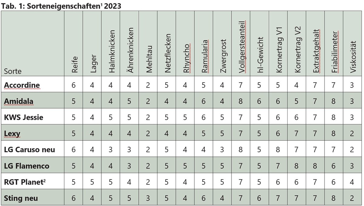 Während der nasskalten Frühjahrswitterung traten verstärkt Netzflecken auf, die sich aber mit einsetzender Trockenheit nicht auf die oberen Blattetagen verlagerten. Daneben gab es im weiteren Vegetationsverlauf einen leichten Befall mit Rhynchosporium und Ramularia. Problematisch erwiesen sich an manchen Standorten die Getreidehähnchen. Zunächst lag der Befall unter der Schadensschwelle, aber eine Insektizidbehandlung zum späteren Zeitpunkt war an einigen Standorten durchaus gerechtfertigt. Eine Besonderheit trat 2023 erstmalig in den Boxberger Beständen auf: die Streifenkrankheit. Da der samenbürtige Pilz nicht flächendeckend auftrat, kam es nicht zu stärkeren Ertragseinbußen und Qualitätsminderungen. Bis auf die schwache Sortierung von 93% bei > 2,5 mm (Vorjahr 96%) und dem niedrigen Vollgerstenertrag von 70 dt/ha liegen die Qualitäten 2023 auf Vorjahresniveau.