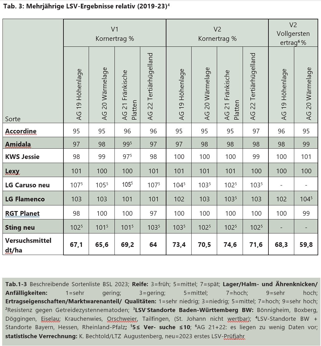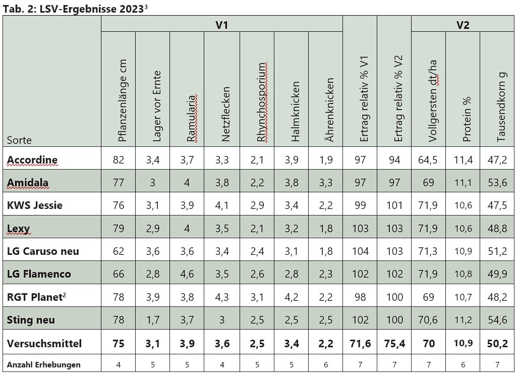 Die neu zugelassene Braugerste LG Caruso bestätigt 2023 die sehr gute Einstufung der BSL (8/7) mit 104% (V1) und 103% (V2) Relativertrag. Über alle Standorte präsentiert sich die Sorte ausgesprochen harmonisch und ertragsstabil. Die bisherigen mehrjährigen Ergebnisse sind vielversprechend. Die kurzwüchsige Sorte zeigt Lagertendenzen und reift etwas später ab. Ährenstabilität und Blattgesundheit sind gut. LG Caruso stand 2023 im Berliner Programm. Eine Entscheidung zur Verarbeitungsempfehlung steht noch aus.