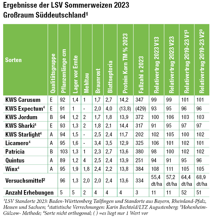 LSV Sommerweizen werden in zwei Intensitätsstufen angelegt: der reduzierten Variante V1 (Verzicht auf Fungizide, Wachstumsregler) und der integrierten Variante V2. 2023 standen in Baden- Württemberg insgesamt neun Sorten zur Prüfung an. Neben den langjährig geprüften A-Sorten Quintus und Licamero standen vor allem die zweijährig geprüften Sorten KWS Carusum (E), Winx (A) sowie KWS Jordum und Patricia (beide B) im Fokus. Neu zugelassene Sorten gab es nicht.