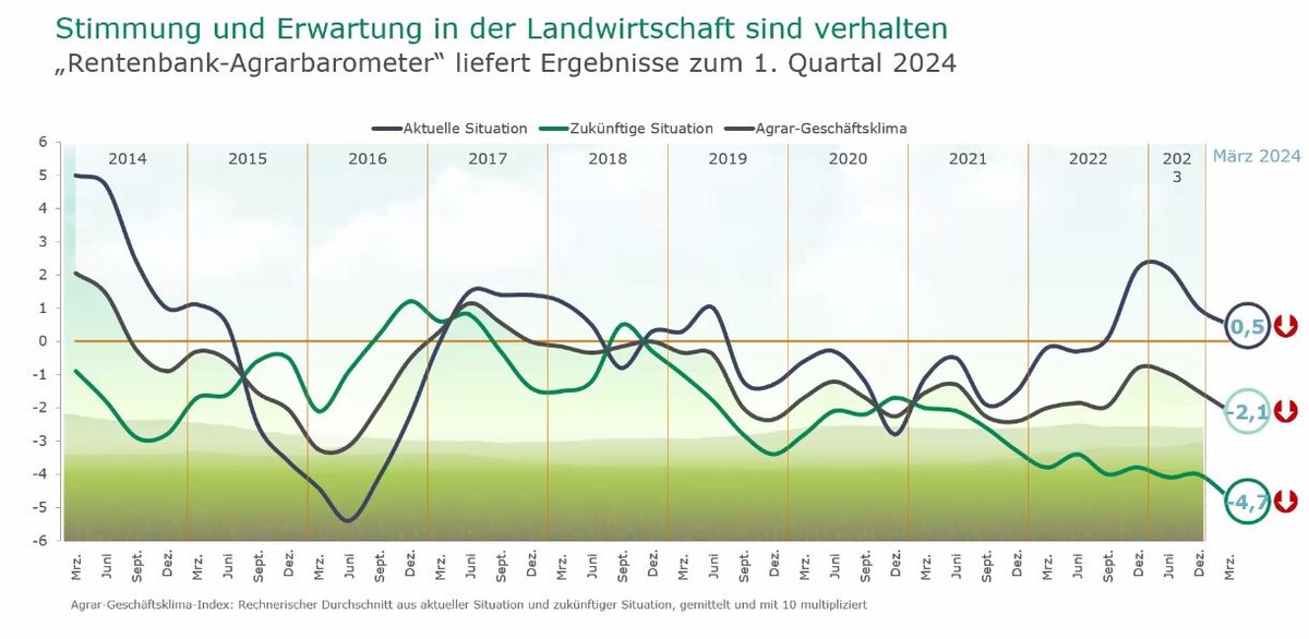 Rund drei Viertel der befragten Landwirte beurteilen ihre aktuelle Lage als zufriedenstellend oder besser. Allerdings sinken diese Werte seit Anfang 2023. Nur etwas mehr als die Hälfte der Landwirte und der diesbezüglich ebenfalls befragten Lohnunternehmer planen Investitionen in den nächsten sechs Monaten. Die im Rentenbank-Agrarbarometer befragten Landwirtinnen und Landwirte stufen ihre aktuelle wirtschaftliche Lage zu 77 Prozent als befriedigend oder besser ein. Auf der Skala des Agrarbarometers, die mögliche Werte von -10 bis +10 Punkte umfasst, liegt die Bewertung damit bei +0,5 Punkten. Allerdings ist der Wert seit Anfang des vergangenen Jahres stark fallend. Gleichzeitig ist die Einschätzung der zukünftigen wirtschaftlichen Lage so schlecht wie nie in den letzten zehn Jahren. 48 Prozent der Befragten geben an, dass sie eine Verschlechterung ihrer wirtschaftlichen Lage erwarten, während 42 Prozent von einer gleichbleibenden Situation ausgehen. Nur 8 Prozent rechnen mit einer Ver-besserung. Auf der Skala des Agrarbarometers ist diese Bewertung mit -4,7 Punkten extrem schwach. Damit sinkt auch die Bewertung der Gesamtsituation, die den Durchschnitt der aktuellen Lage und der Erwartungen abbildet, weiter. Dieser als „Agrar-Geschäftsklimaindex“ bezeichnete Wert liegt mit nun -2,1 Punkten unter dem Wert zu Beginn des letzten Jahres (-1,5 Punkte).