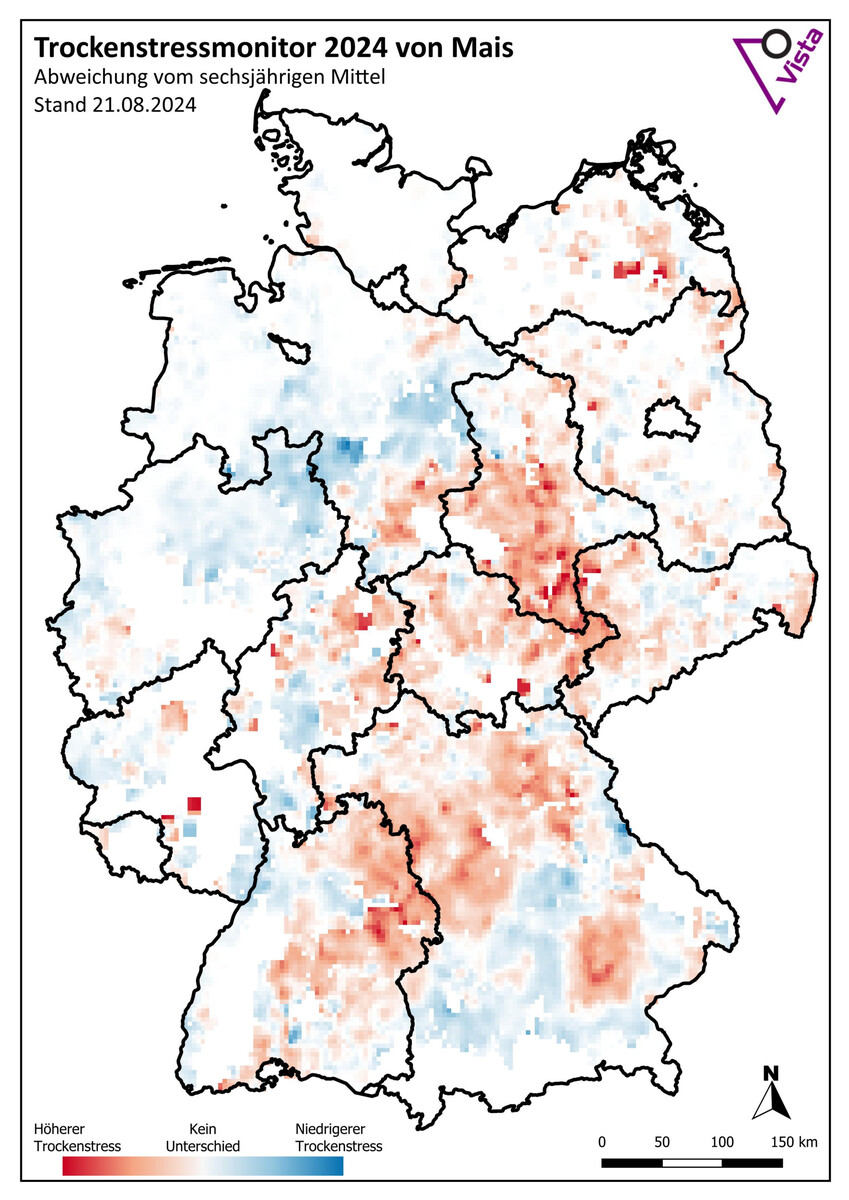 Der BayWa Dürremonitor ist ein Projekt der BayWa AG und der Vista Geowissenschaftliche Fernerkundung GmbH: Eine interaktive Karte zeigt den durchschnittlichen Trockenstress von Winterweizen- und Maispflanzen in den sieben Tagen vor dem angegebenen Datum an. Für den BayWa Dürremonitor nutzt Vista neben üblichen Satellitendaten hydrologische, meteorologische und topografische Informationen. Die Kombination dieser Daten mit dem Vista-eigenen Pflanzenwachstumsmodell PROMET ermöglicht eine Aussage darüber, ob eine bestimmte Pflanze unter Trockenstress leidet. Gestartet wurde der Dürremonitor im vergangenen Jahr für Winterweizen, dieses Jahr kam Mais dazu. Überdies gibt es eine Sonderauswertung für Weizen zur Hochwassersituation im Juni. Die Webseite wird durch Lösungsangebote der BayWa ergänzt, um Entwicklungen wie Dürre Rechnung zu tragen.