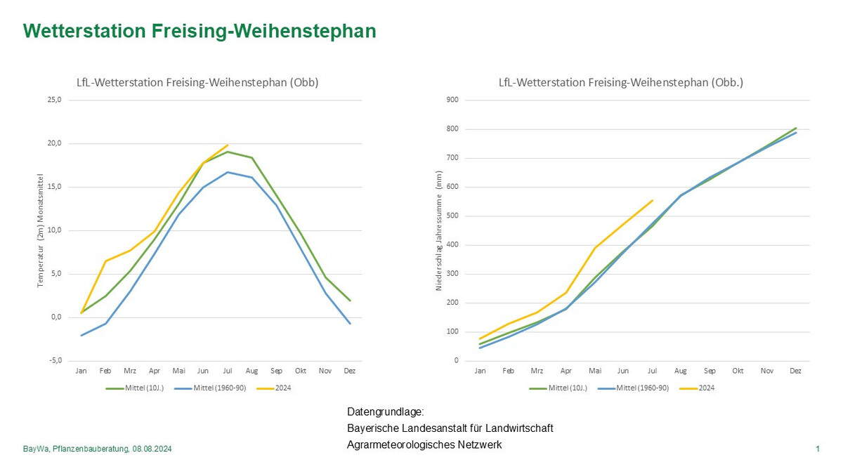 „Freising hat ungefähr 800 mm Jahresniederschlag. Im Gegensatz zur Temperatur gibt es beim Niederschlag im zehn- und langjährigen Mittel kaum einen Unterschied. Interessant ist, dass 2024 eigentlich ein überdurchschnittlich nasser Jahrgang in der Region ist.“ Das treffe aber für viele Regionen zu und hänge sicher mit den hohen Niederschlägen im April, Mai und dem Hochwasser im Juni zusammen.