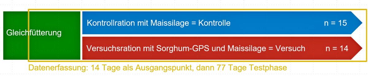 Aufgrund der geringen Energiekonzentration der Sorghum-Ganzpflanzensilage (5,4 MJ NEL/kg Trockenmasse) im Vergleich zur Maissilage (6,8 MJ NEL/kg Trockenmasse) wurde die Maissilage in der Versuchsration nur zu 70 Prozent durch Sorghum-Ganzpflanzensilage ersetzt. Um in den beiden Rationen weitestgehend eine gleiche Energiekonzentration und Konzentration an nutzbarem Rohprotein (nXP) zu erreichen, wurde in der Kontrollration außerdem mehr Stroh, in der Versuchsration hingegen kein Rapsextraktionsschrot und mehr von der Schrotmischung (Winterweizen/Wintergerste/Ackerbohnen 40/20/40 Prozent) gefüttert. Neben der Teilmischration wurde Leistungsfutter nach Standardlaktationskurve am automatischen Melksystem, mit unterschiedlichen Kurven für erstlaktierende Kühe und Tiere ab der zweiten Laktation, gefüttert.