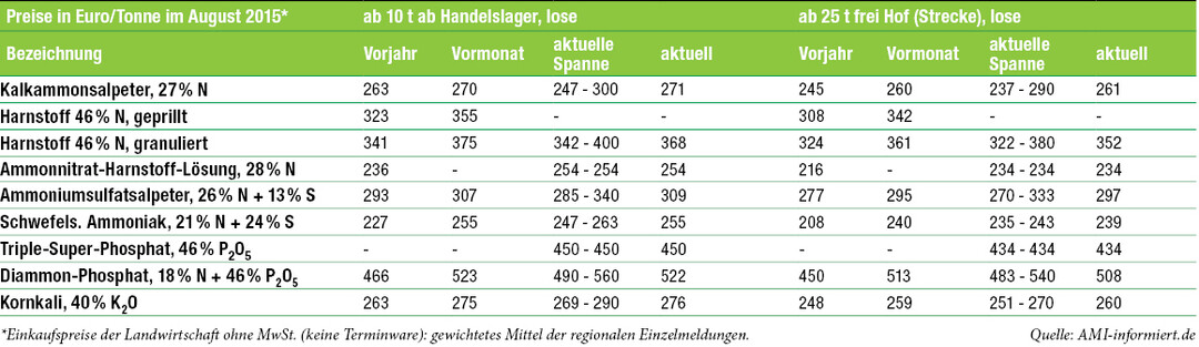 Einkaufspreise der Landwirte für ausgesuchte Düngemittel in Süddeutschland Veröffentlicht am Erschienen am 12.09.2015 erschienen in BW Wochenblatt 37#322015 Sie haben ein BBZ-Abo oder ein BWagrar Digital-Abo? Sie haben ein BWagrar Print-Abo? Rabattiertes BWagrar Digital-Upgrade bestellen Weiterlesen mit Digital-Abo... BBZ Digital Probe-Abo Die Regionalausgabe BBZ als E-Paper 3 Tage vor der gedruckten Ausgabe Alle BWW+ Inhalte auf bw-wochenblatt.de Aktuelle Marktdaten und Marktberichte Endet automatisch nach 4 Wochen jetzt 4 Wochen testen 8,00 EUR / 4 Wochen BWagrar Digital Probe-Abo Die Regionalausgabe BWagrar als E-Paper 3 Tage vor der gedruckten Ausgabe Alle BWW+ Inhalte auf bw-wochenblatt.de Aktuelle Marktdaten und Marktberichte Endet automatisch nach 4 Wochen 8,00 EUR / 4 Wochen Aus der Branche WERBUNG ARNOLD – die frühe Sojabohne mit amtlich bestätigter Ertragsstärke Barrierefreiheits-Menü Schriftgröße Normal Zurücksetzen Kontrast Normal Hoch Normal Menü sichtbar Ja Nein Ja Über den ersten Skip-Link der Seite „Barrierefreiheits-Einstellungen“ können Sie das Menü jederzeit wieder einblenden. Einstellungen Alles zurücksetzen Ort �ndern Geben Sie die Postleitzahl Ihres Orts ein. Ort �ndern
