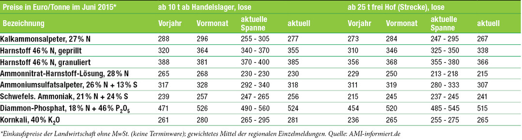 Einkaufspreise der Landwirte für ausgesuchte Düngemittel in Süddeutschland Veröffentlicht am Erschienen am 18.07.2015 erschienen in BW Wochenblatt 29#322015 Sie haben ein BBZ-Abo oder ein BWagrar Digital-Abo? Sie haben ein BWagrar Print-Abo? Rabattiertes BWagrar Digital-Upgrade bestellen Weiterlesen mit Digital-Abo... BBZ Digital Probe-Abo Die Regionalausgabe BBZ als E-Paper 3 Tage vor der gedruckten Ausgabe Alle BWW+ Inhalte auf bw-wochenblatt.de Aktuelle Marktdaten und Marktberichte Endet automatisch nach 4 Wochen jetzt 4 Wochen testen 8,00 EUR / 4 Wochen BWagrar Digital Probe-Abo Die Regionalausgabe BWagrar als E-Paper 3 Tage vor der gedruckten Ausgabe Alle BWW+ Inhalte auf bw-wochenblatt.de Aktuelle Marktdaten und Marktberichte Endet automatisch nach 4 Wochen 8,00 EUR / 4 Wochen Aus der Branche WERBUNG ARNOLD – die frühe Sojabohne mit amtlich bestätigter Ertragsstärke Barrierefreiheits-Menü Schriftgröße Normal Zurücksetzen Kontrast Normal Hoch Normal Menü sichtbar Ja Nein Ja Über den ersten Skip-Link der Seite „Barrierefreiheits-Einstellungen“ können Sie das Menü jederzeit wieder einblenden. Einstellungen Alles zurücksetzen Ort �ndern Geben Sie die Postleitzahl Ihres Orts ein. Ort �ndern