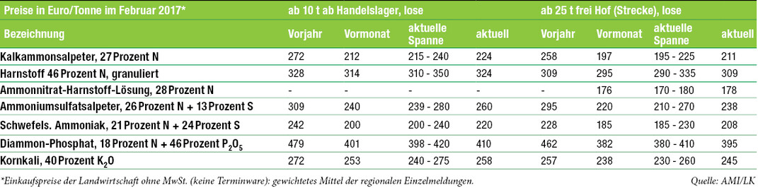 Einkaufspreise der Landwirte für ausgesuchte Düngemittel in Süddeutschland Veröffentlicht am Erschienen am 25.03.2017 erschienen in BW Wochenblatt 12#322017 Sie haben ein BBZ-Abo oder ein BWagrar Digital-Abo? Sie haben ein BWagrar Print-Abo? Rabattiertes BWagrar Digital-Upgrade bestellen Weiterlesen mit Digital-Abo... BBZ Digital Probe-Abo Die Regionalausgabe BBZ als E-Paper 3 Tage vor der gedruckten Ausgabe Alle BWW+ Inhalte auf bw-wochenblatt.de Aktuelle Marktdaten und Marktberichte Endet automatisch nach 4 Wochen jetzt 4 Wochen testen 8,00 EUR / 4 Wochen BWagrar Digital Probe-Abo Die Regionalausgabe BWagrar als E-Paper 3 Tage vor der gedruckten Ausgabe Alle BWW+ Inhalte auf bw-wochenblatt.de Aktuelle Marktdaten und Marktberichte Endet automatisch nach 4 Wochen 8,00 EUR / 4 Wochen Aus der Branche WERBUNG ARNOLD – die frühe Sojabohne mit amtlich bestätigter Ertragsstärke Barrierefreiheits-Menü Schriftgröße Normal Zurücksetzen Kontrast Normal Hoch Normal Menü sichtbar Ja Nein Ja Über den ersten Skip-Link der Seite „Barrierefreiheits-Einstellungen“ können Sie das Menü jederzeit wieder einblenden. Einstellungen Alles zurücksetzen Ort �ndern Geben Sie die Postleitzahl Ihres Orts ein. Ort �ndern