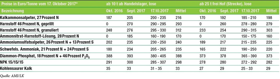 Einkaufspreise der Landwirte für ausgesuchte Düngemittel in Süddeutschland Veröffentlicht am Erschienen am 28.10.2017 erschienen in BW Wochenblatt 43#322017 Sie haben ein BBZ-Abo oder ein BWagrar Digital-Abo? Sie haben ein BWagrar Print-Abo? Rabattiertes BWagrar Digital-Upgrade bestellen Weiterlesen mit Digital-Abo... BBZ Digital Probe-Abo Die Regionalausgabe BBZ als E-Paper 3 Tage vor der gedruckten Ausgabe Alle BWW+ Inhalte auf bw-wochenblatt.de Aktuelle Marktdaten und Marktberichte Endet automatisch nach 4 Wochen jetzt 4 Wochen testen 8,00 EUR / 4 Wochen BWagrar Digital Probe-Abo Die Regionalausgabe BWagrar als E-Paper 3 Tage vor der gedruckten Ausgabe Alle BWW+ Inhalte auf bw-wochenblatt.de Aktuelle Marktdaten und Marktberichte Endet automatisch nach 4 Wochen 8,00 EUR / 4 Wochen Aus der Branche WERBUNG ARNOLD – die frühe Sojabohne mit amtlich bestätigter Ertragsstärke Barrierefreiheits-Menü Schriftgröße Normal Zurücksetzen Kontrast Normal Hoch Normal Menü sichtbar Ja Nein Ja Über den ersten Skip-Link der Seite „Barrierefreiheits-Einstellungen“ können Sie das Menü jederzeit wieder einblenden. Einstellungen Alles zurücksetzen Ort �ndern Geben Sie die Postleitzahl Ihres Orts ein. Ort �ndern