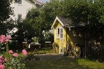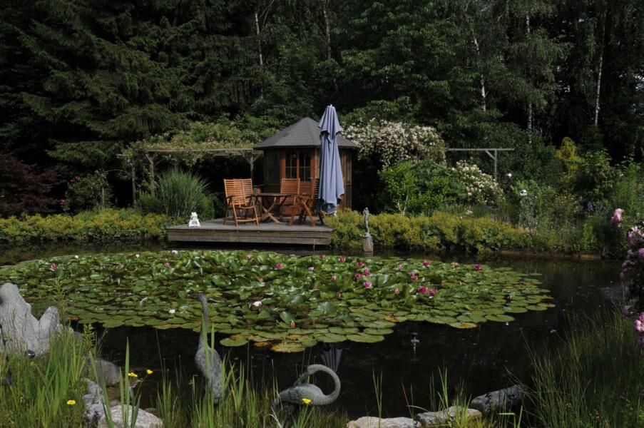 Ein kleiner Höhepunkt auch der Garten von Hannelore und Roland Birkel in Bußmannshausen. Auf 4000 Quadratmetern wachsen Stauden und Rosen, Clematis und Pflanzen von der Insel Madeira um einen Seerosenteich mit Koi-Karpfen sowie Bau- und Kunstwerken aus eigener Herstellung.