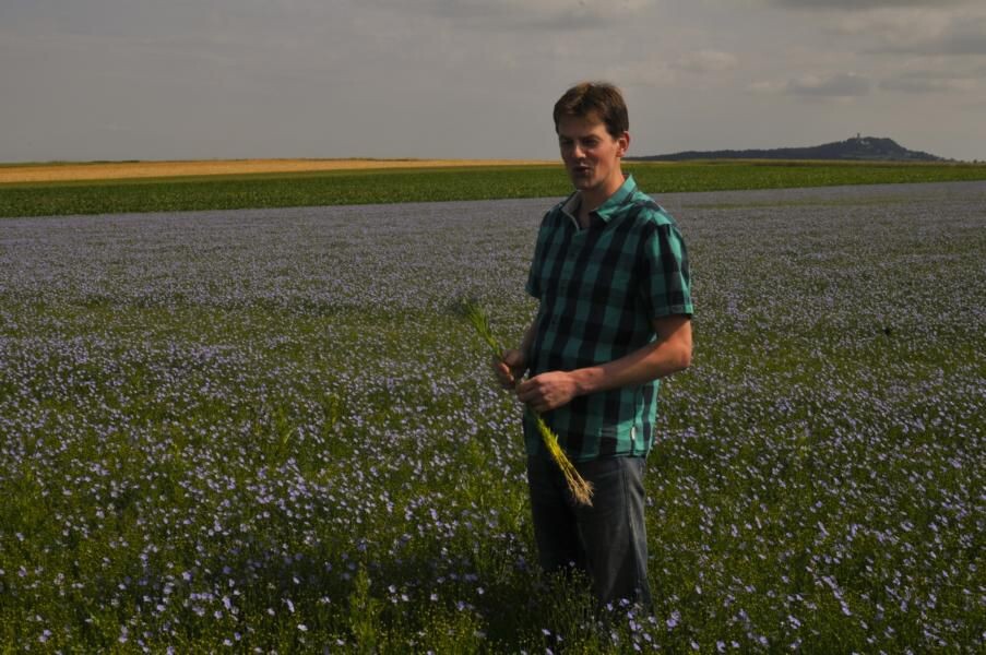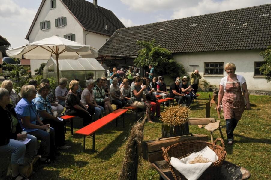 Eine Fahrt ins Blaue war es zur Familie Igel in Dürmentingen. Hofnachfolger Simon Igel führte uns aufs blühende Flachsfeld. seine Mutter Elfriede gab anschließend einen Einblick in die Verarbeitung mit Verkostung von Leinöl. Das Zeitfenster der Leinblüte beträgt täglich zwei Stunden zwischen 10 und 12 Uhr. Tatsächlich: Wer sich einen Strauß der zartblauen Blumen mitgenommen hatte musste nach dem Mittagessen feststellen, dass die Blüten alle abgefallen waren.