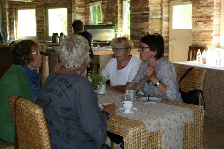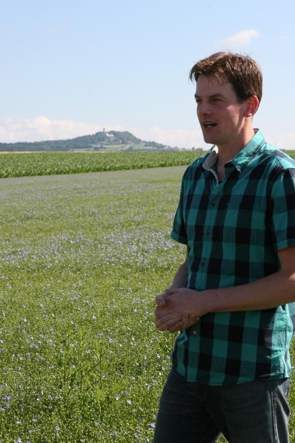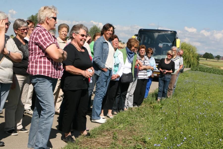 Eine Fahrt ins Blaue war es zur Familie Igel in Dürmentingen. Hofnachfolger Simon Igel führte uns aufs blühende Flachsfeld. seine Mutter Elfriede gab anschließend einen Einblick in die Verarbeitung mit Verkostung von Leinöl. Das Zeitfenster der Leinblüte beträgt täglich zwei Stunden zwischen 10 und 12 Uhr. Tatsächlich: Wer sich einen Strauß der zartblauen Blumen mitgenommen hatte, musste nach dem Mittagessen feststellen, dass die Blüten alle abgefallen waren.