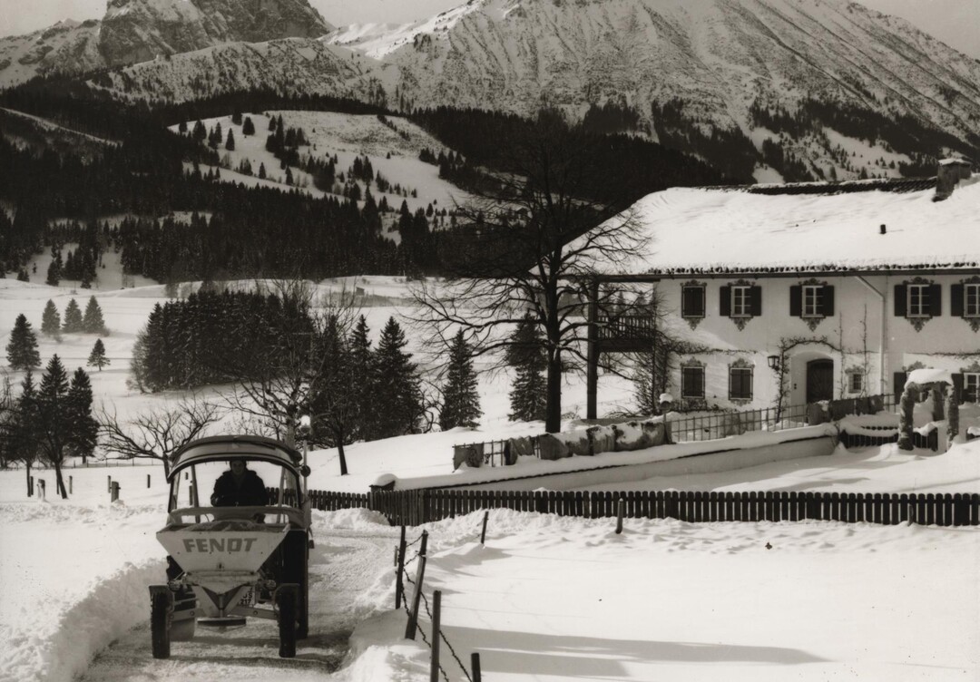 Ein Fendt-Geräteträger beim Splittstreuen. Das Bild entstand bei Pfronten im Allgäu.