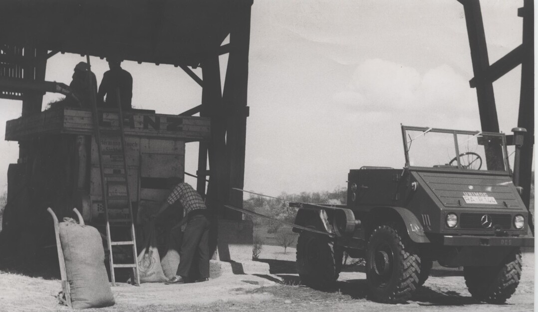 1961 hatte der Ernte-Hofdrusch noch große Bedeutung. In Feldscheunen fehlte dabei oft die elektrische Energie, sodass der Schlepper mit Riemenscheibe einspringen musste.