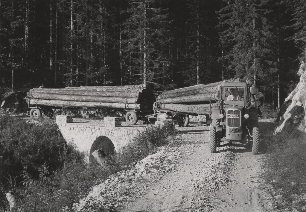 Der Schlepper MAN Ackerdiesel war ein beliebter Hofschlepper für alle Arbeiten in Hof, Feld und Wald, wie hier bei der Abfuhr von Stämmen.