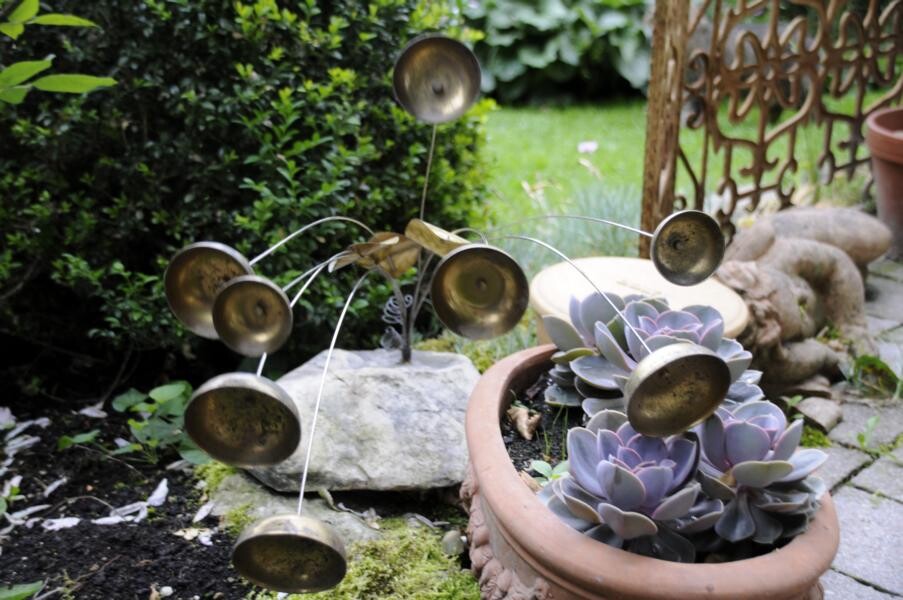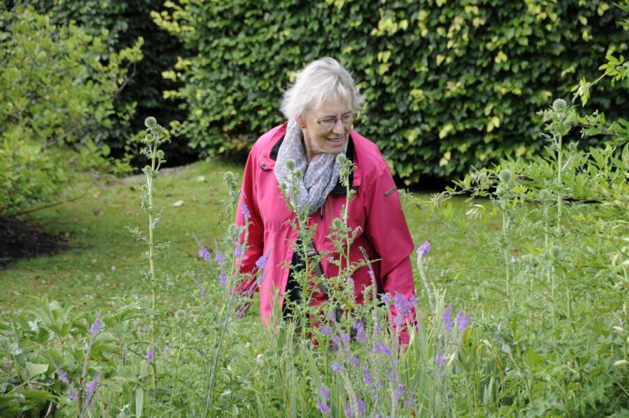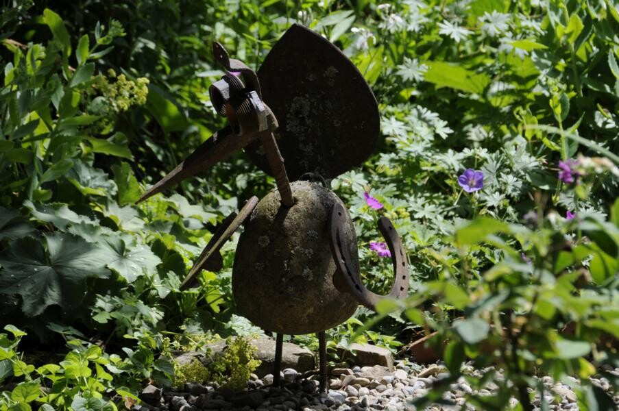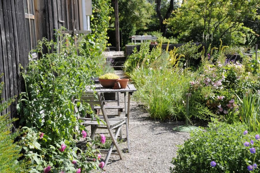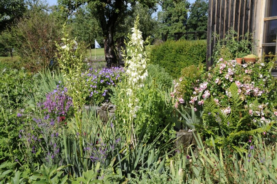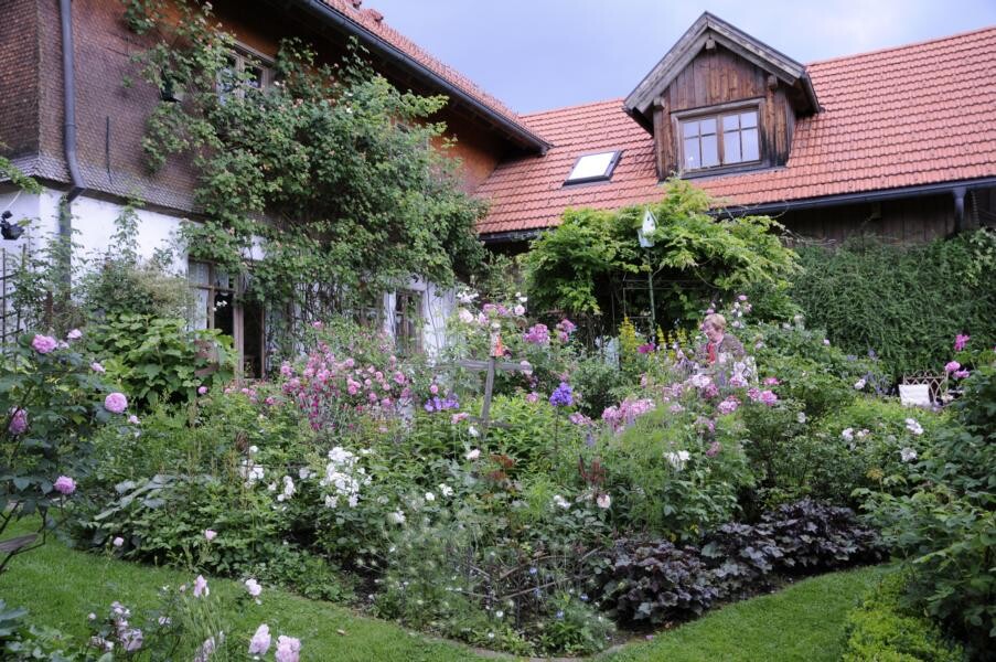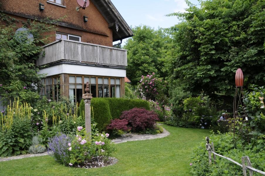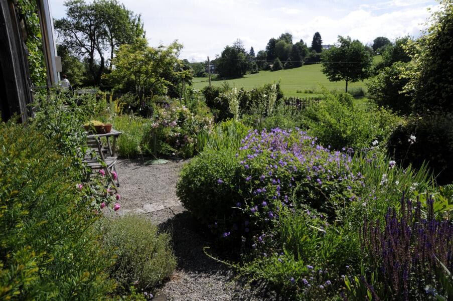 Elke Zimmermann und Michael Nickel übernahmen einst das alte Bauernhaus der Großeltern und gestalteten das umliegende Gelände nach ihren Plänen um. Heute haben sie einen Garten, der gestaffelt auf unterschiedlichen Höhen mit verschiedenen Terrassen, Trockenmauern, Bauerngarten und einem Gartenteich beeindruckt. Ihren Lieblingsblumen, den Iris, haben die studierten Gartenbauer einen eigenen Gartenteil reserviert. Weitere Favoriten sind Pfingstrosen und Frauenmantel, aber auch Tulpen und Rosen. Verschiedene Sitzplätze eröffnen immer wieder neue Blicke in das Allgäuer Hügelland.