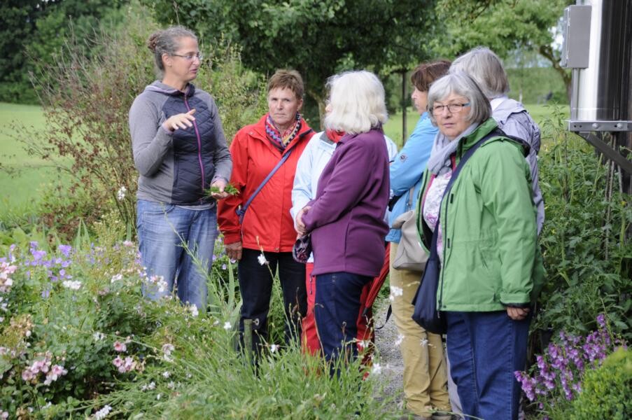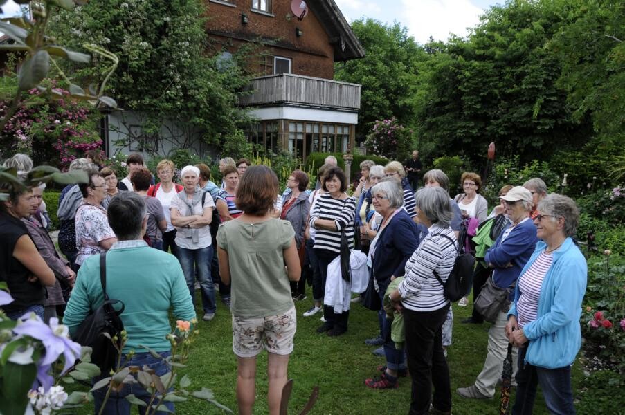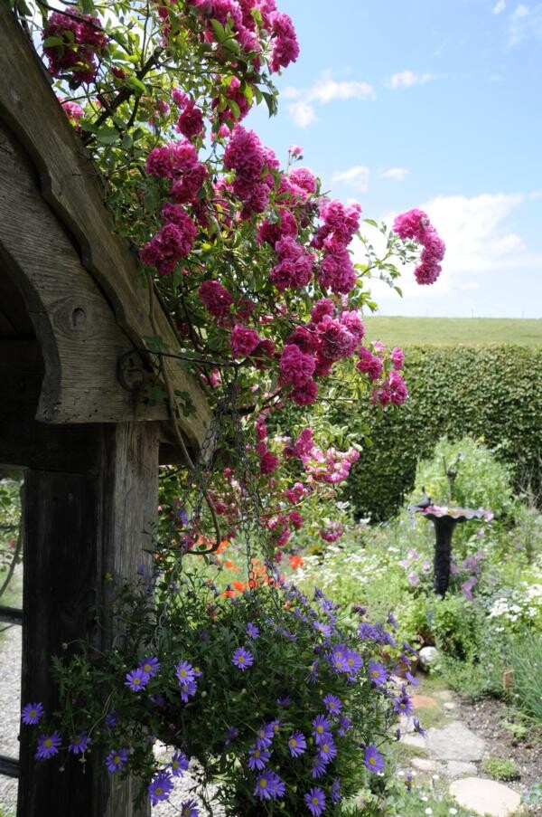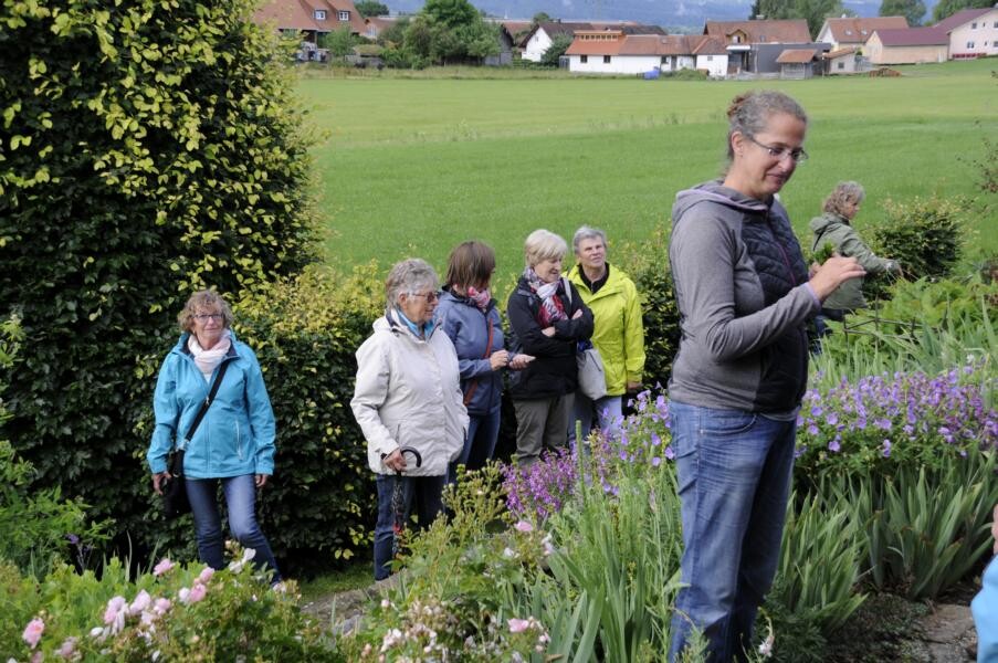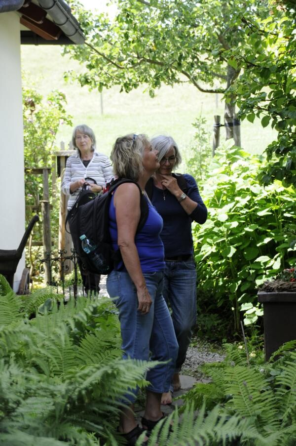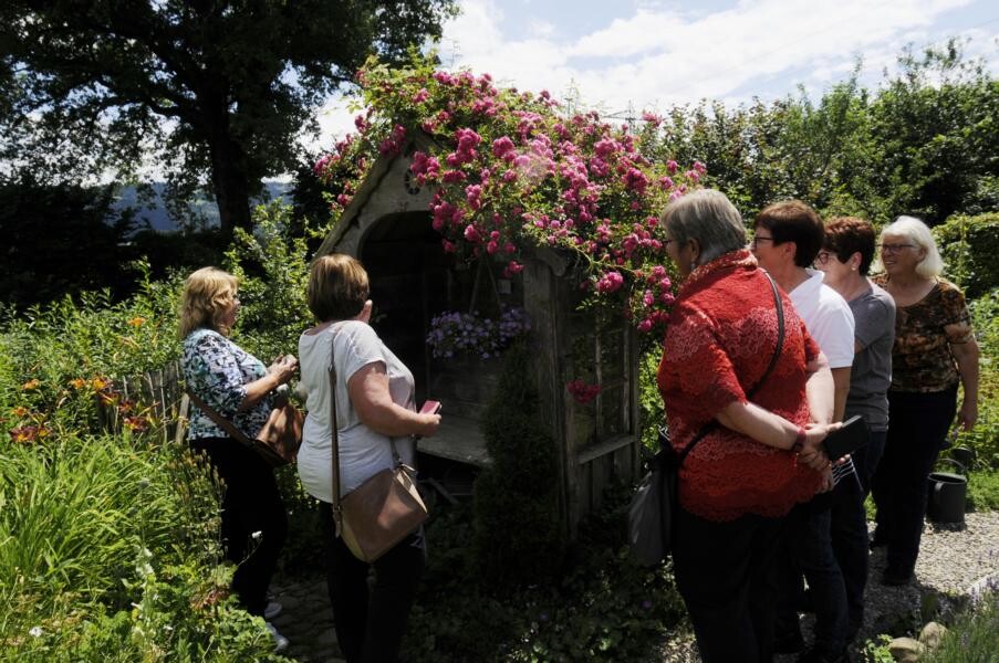 Ihren Abschluss fand die Gartenfahrt dann bei Kaffee und Kuchen im privaten Rosenparadies von Andrea Heckmann. Auf 735 Meter Höhe wachsen die prächtigsten Rosen in einem romantischen Garten mit spektakulären Ausblicken in die Westallgäuer Landschaft und den Bregenzer Wald. Die meisten Rosen im Garten gehören zu den Alten Rosen, die zu beeindruckenden Büschen herangewachsen sind. Die einmal blühende „Constanze Spry“ hat eine Seite des Hauses bis zum Dachfirst erobert und hüllt die ganze Terrasse mit ihrem würzigen Myhrreduft ein.