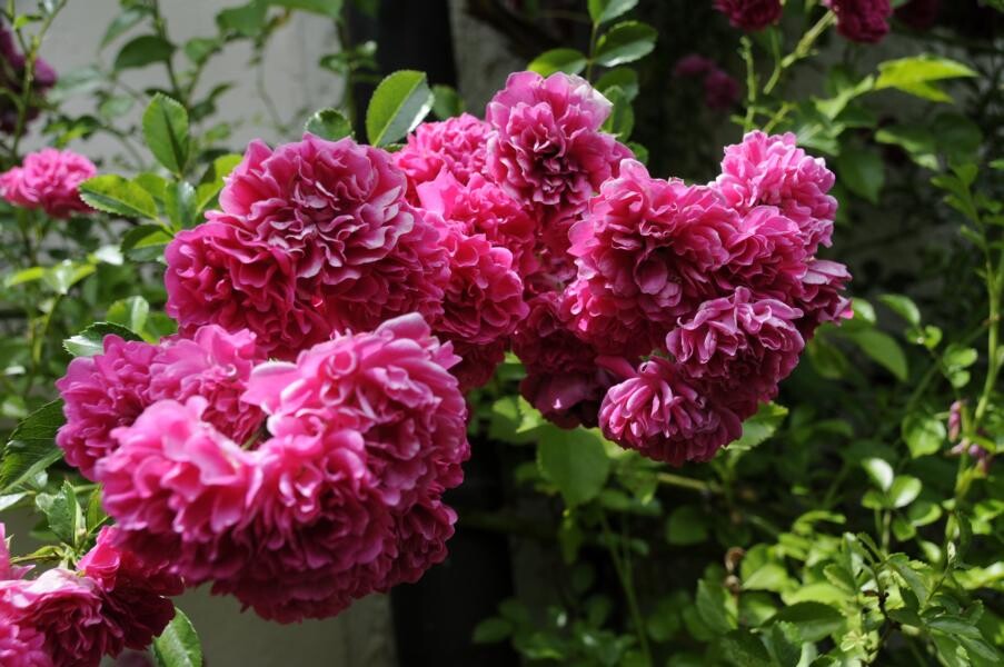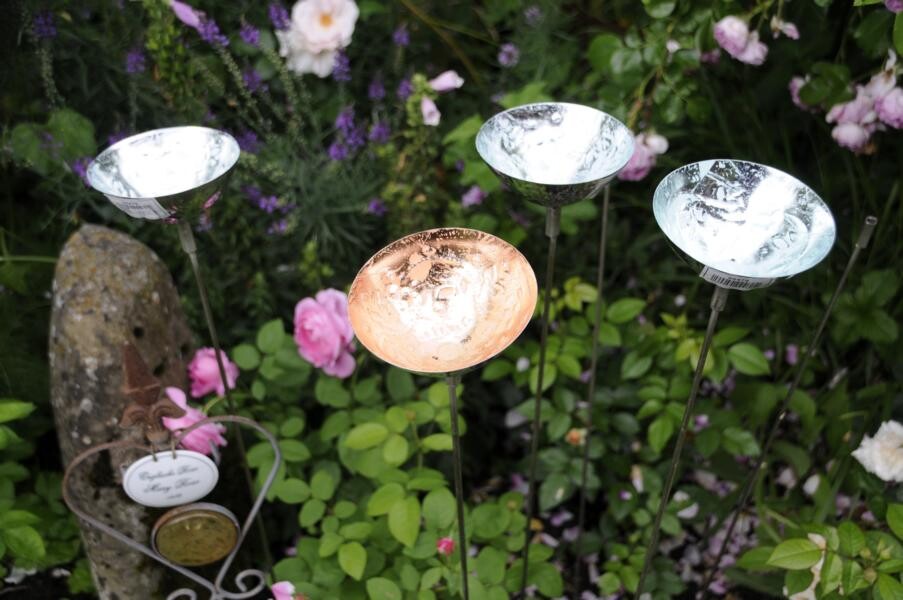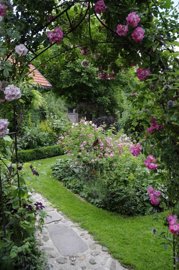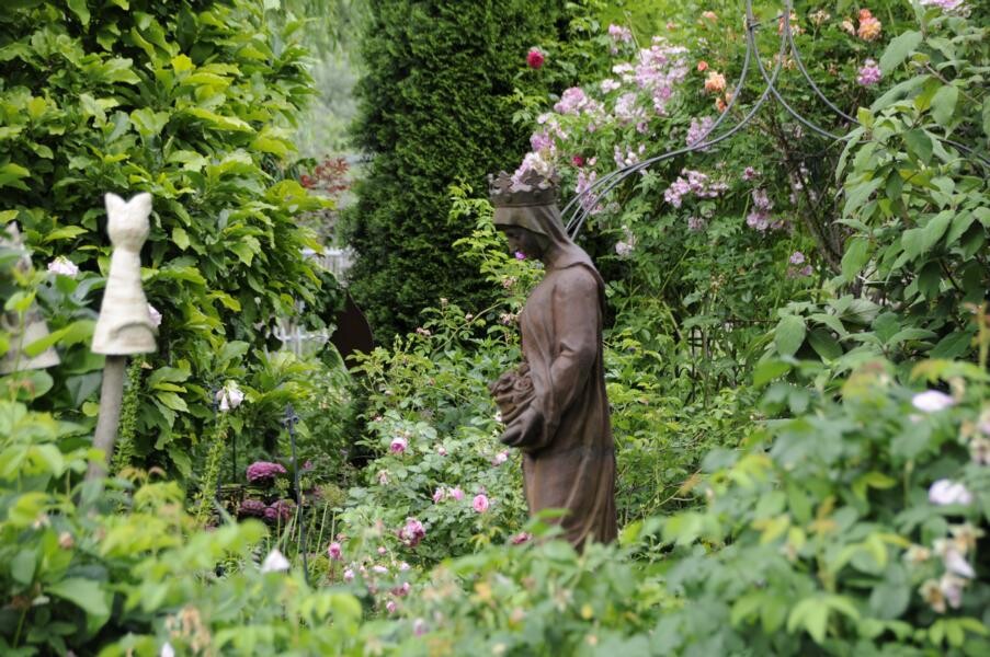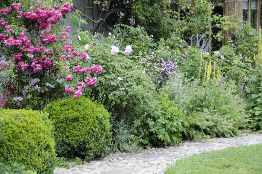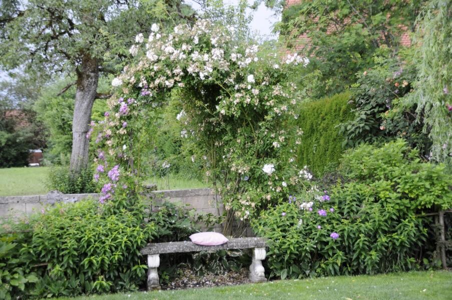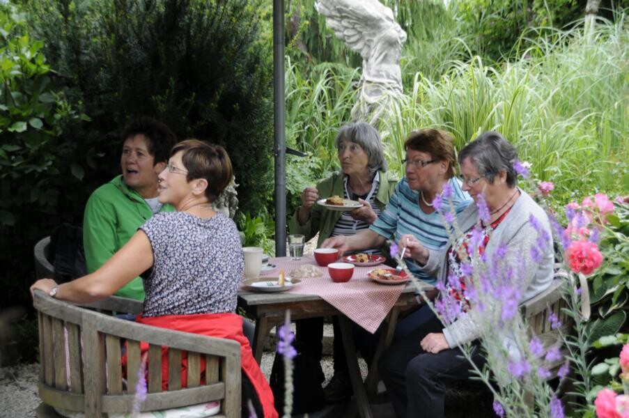 Ihren Abschluss fand die Gartenfahrt dann bei Kaffee und Kuchen im privaten Rosenparadies von Andrea Heckmann. Auf 735 Meter Höhe wachsen die prächtigsten Rosen in einem romantischen Garten mit spektakulären Ausblicken in die Westallgäuer Landschaft und den Bregenzer Wald. Die meisten Rosen im Garten gehören zu den Alten Rosen, die zu beeindruckenden Büschen herangewachsen sind. Die einmal blühende „Constanze Spry“ hat eine Seite des Hauses bis zum Dachfirst erobert und hüllt die ganze Terrasse mit ihrem würzigen Myhrreduft ein.