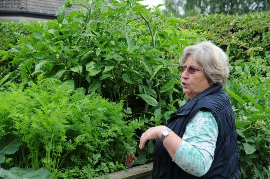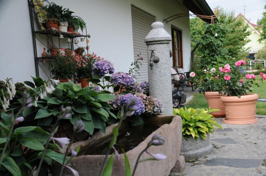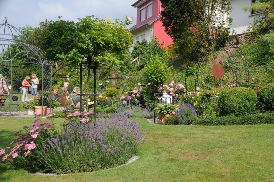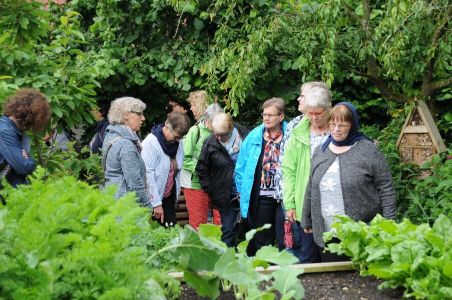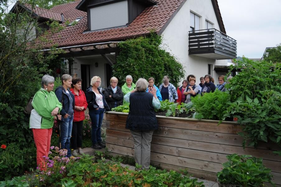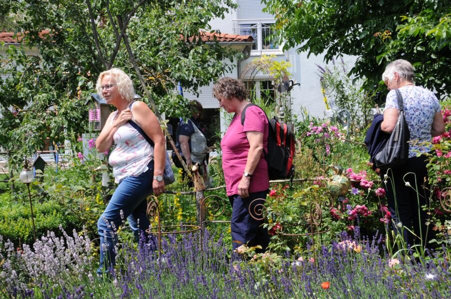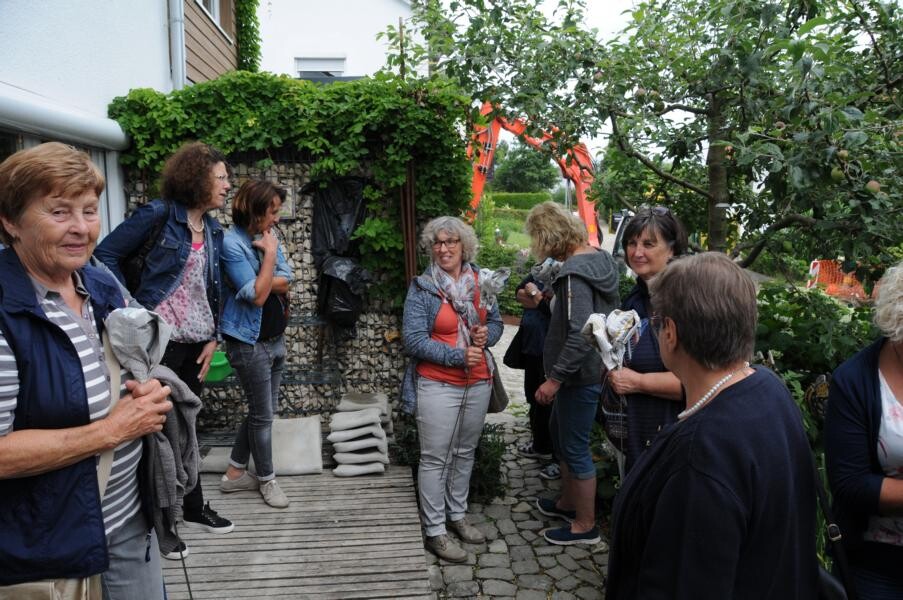 Inge Degenhardt in Sigmaringen-Laiz steht bereits wartend in der Einfahrt, als der Bus mit knapp 50 Frauen – alles begeisterte Gärtnerinnen – anrollt und lädt herzlich ein, einen Blick in ihren privaten Garten zu werfen. Es ist eine Kombination aus Nutz- und Ziergarten. Viel Leidenschaft steckt sie in Gemüsegarten und Beerensträucher. Der Teich, der lange Zeit eine schattige Ecke im Garten domierte musste vor ein paar Jahren einem Sitzplatz unter der üppigen Trauerweide weichen. An dem heißen Sommertag ein begehrter Platz der Gartenfahrten-Teilnehmerinnen.