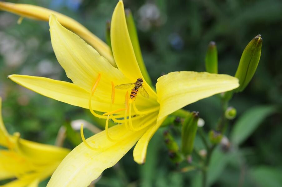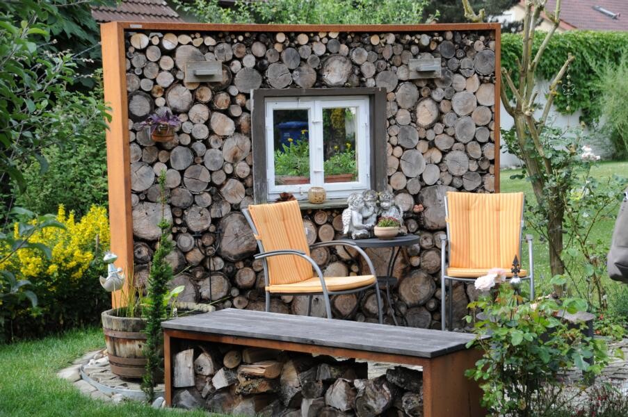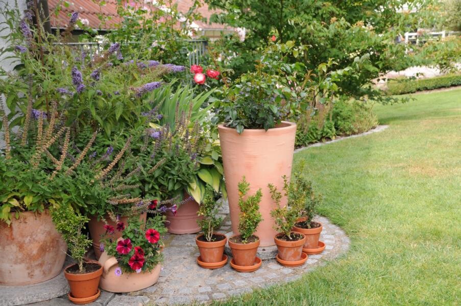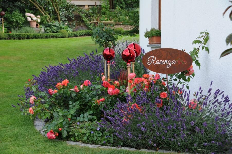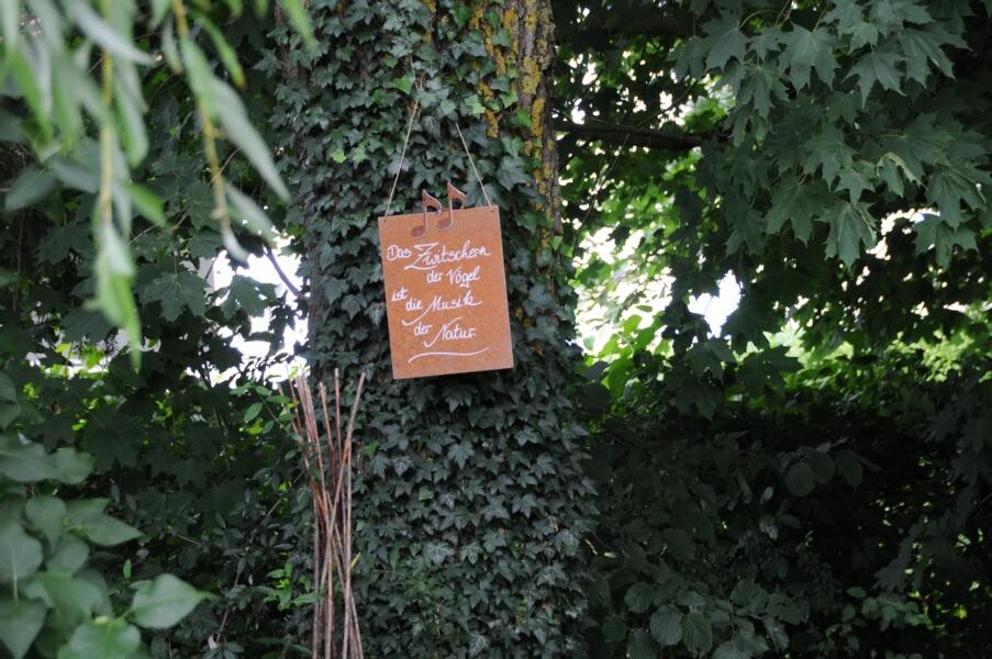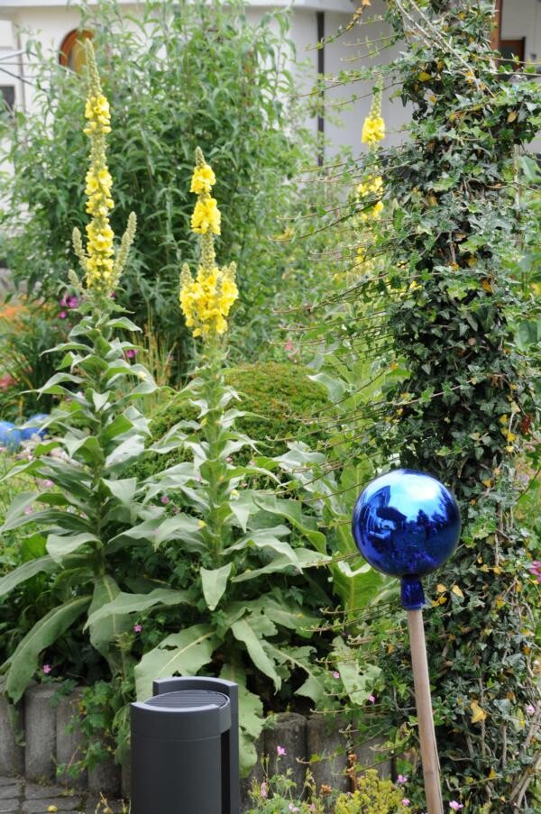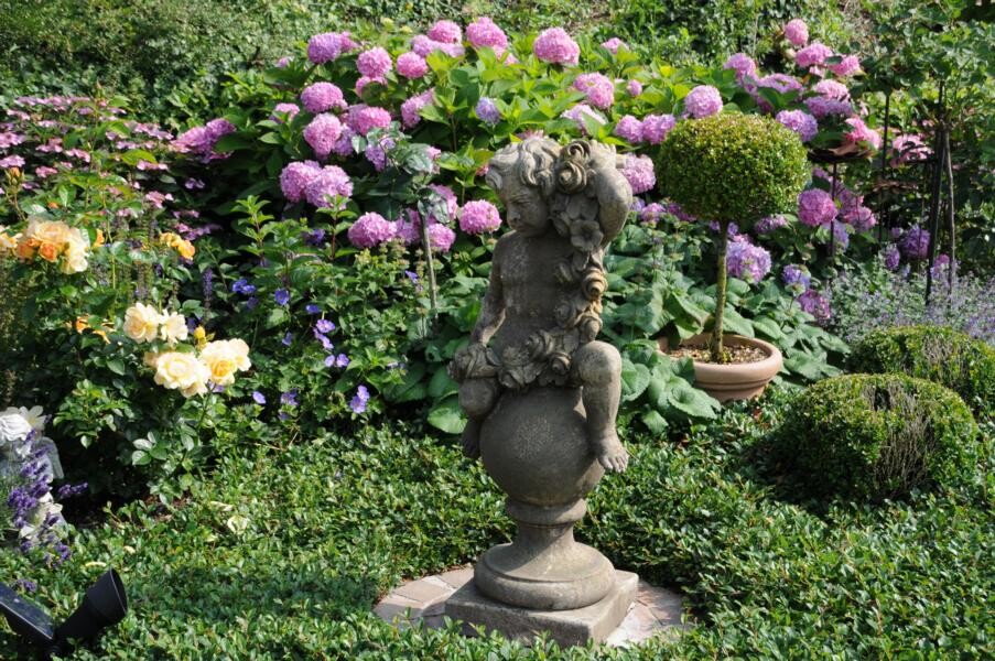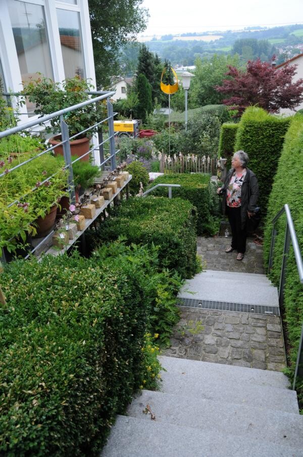 Kontrastreich dazu ist der Garten von Sigrid Wolf, der nur wenige Meter weiter zu finden ist. Die passionierte Gärtnerin hat sich zahlreiche Sitzecken geschaffen und jüngst sogar einen Bachlauf. Insektenweide für große und kleine Tiere zu sein, ist Sigrid Wolf ein wichtiges Anliegen. Zahlreiche Schmetterlinge tanzen über den duftenden Tagetes und weiteren Stauden. Auch hier finden Beerengarten und Gemüse ihren Platz. Besondere Leidenschaft sind jedoch die fein geschnittenen Buchsbüsche. Ob Kegel oder Ornamente – ein echter Hingucker.