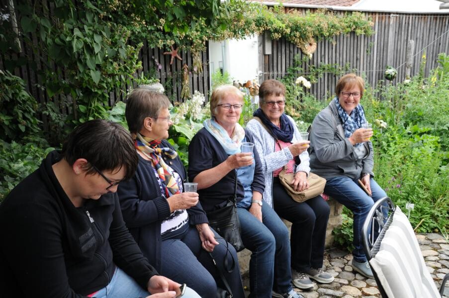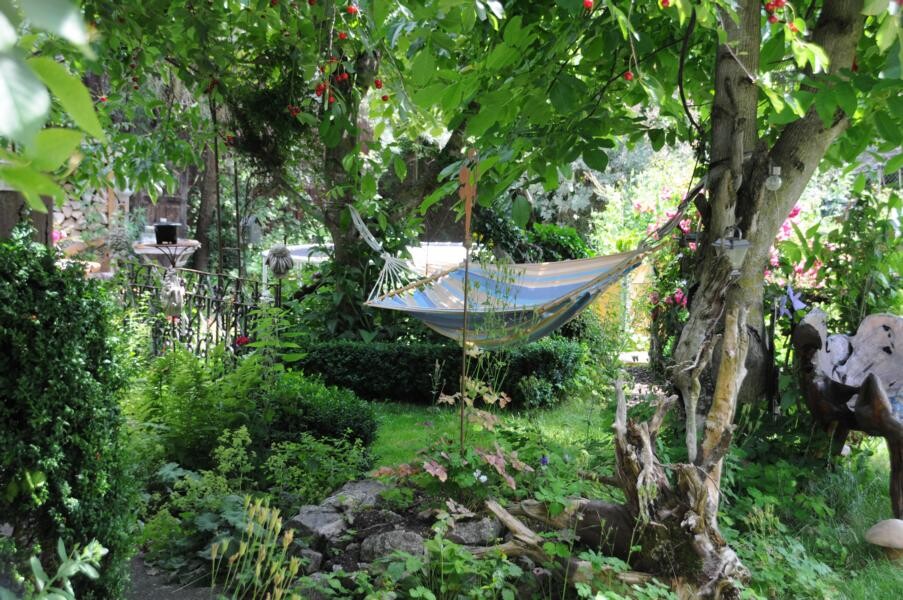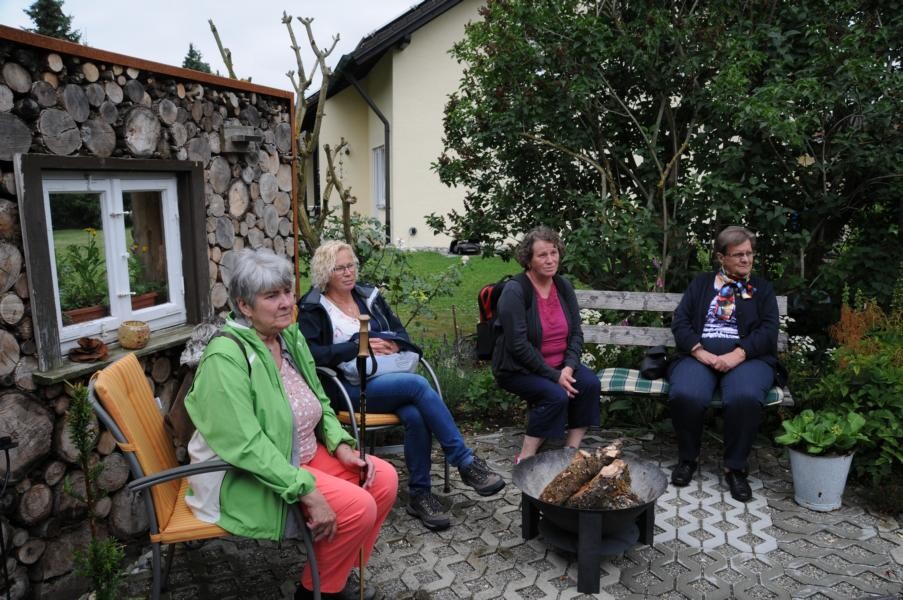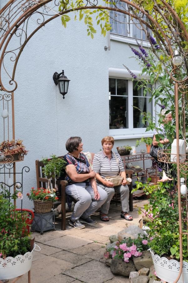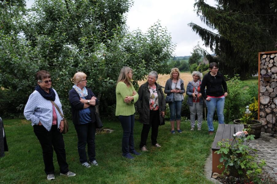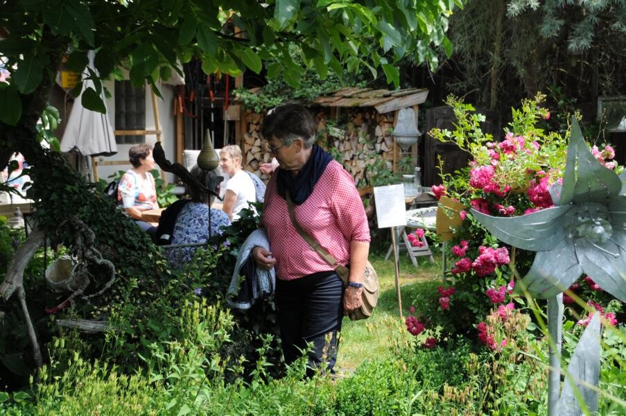 Eine wahre Idylle haben sich auch Petra und Gerhard Knaus geschaffen. Das alte Bauernhaus wurde zum Wohnhaus umgaubt, das Grundstück zum Wohlfühlgarten. Hohe Bäume spenden Schatten und Blumen aller Art dürfen wachsen. Gerhard Knaus sagt selbst, dass wachsen darf, was will, wobei die regelmäßige Pflege unverkennbar ist. Hier eine Wildblumenmischung, dort die Tomaten, die vom vergangenen Jahr wieder aussamen. Es gibt Hingucker an jeder Ecke. Wunderschön ergänzt durch die zahlreichen Patchwork-Arbeiten der Hausherrin. Und in der Hängematte der Kinder ruht sich auch gern die ein oder andere Teilnehmerin aus.