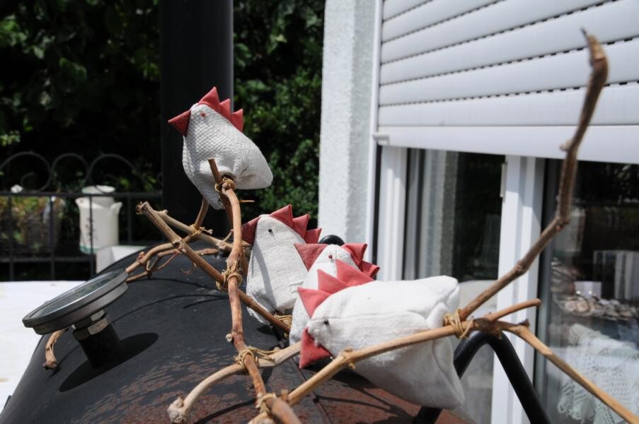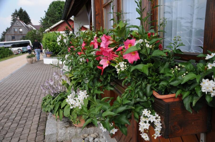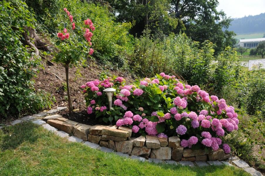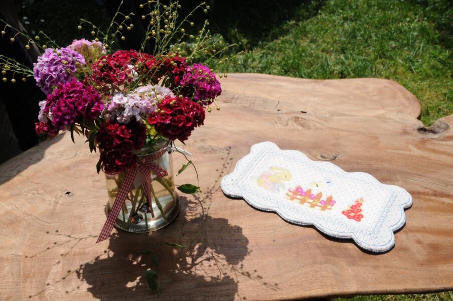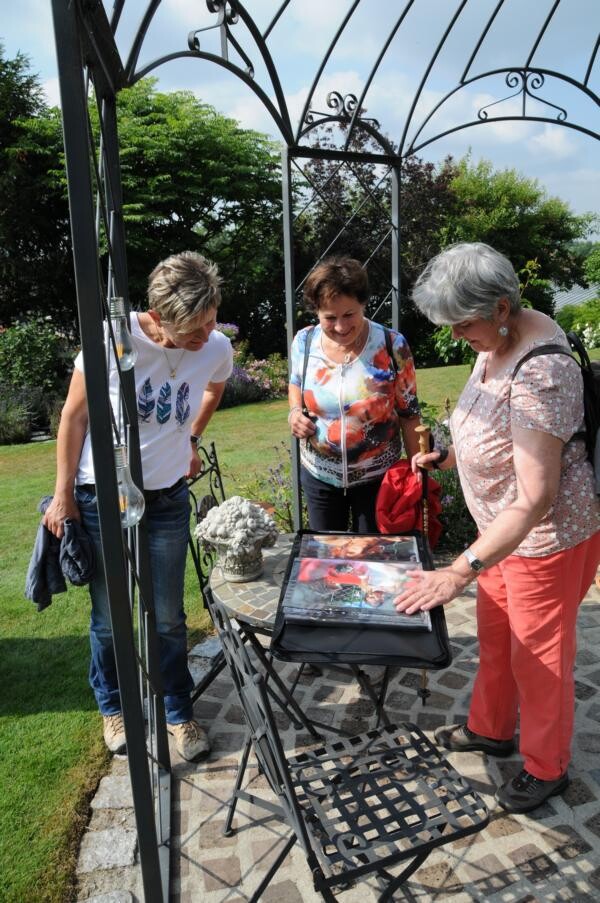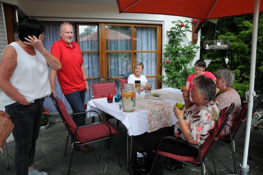 Eine wahre Idylle haben sich auch Petra und Gerhard Knaus geschaffen. Das alte Bauernhaus wurde zum Wohnhaus umgaubt, das Grundstück zum Wohlfühlgarten. Hohe Bäume spenden Schatten und Blumen aller Art dürfen wachsen. Gerhard Knaus sagt selbst, dass wachsen darf, was will, wobei die regelmäßige Pflege unverkennbar ist. Hier eine Wildblumenmischung, dort die Tomaten, die vom vergangenen Jahr wieder aussamen. Es gibt Hingucker an jeder Ecke. Wunderschön ergänzt durch die zahlreichen Patchwork-Arbeiten der Hausherrin. Und in der Hängematte der Kinder ruht sich auch gern die ein oder andere Teilnehmerin aus.
