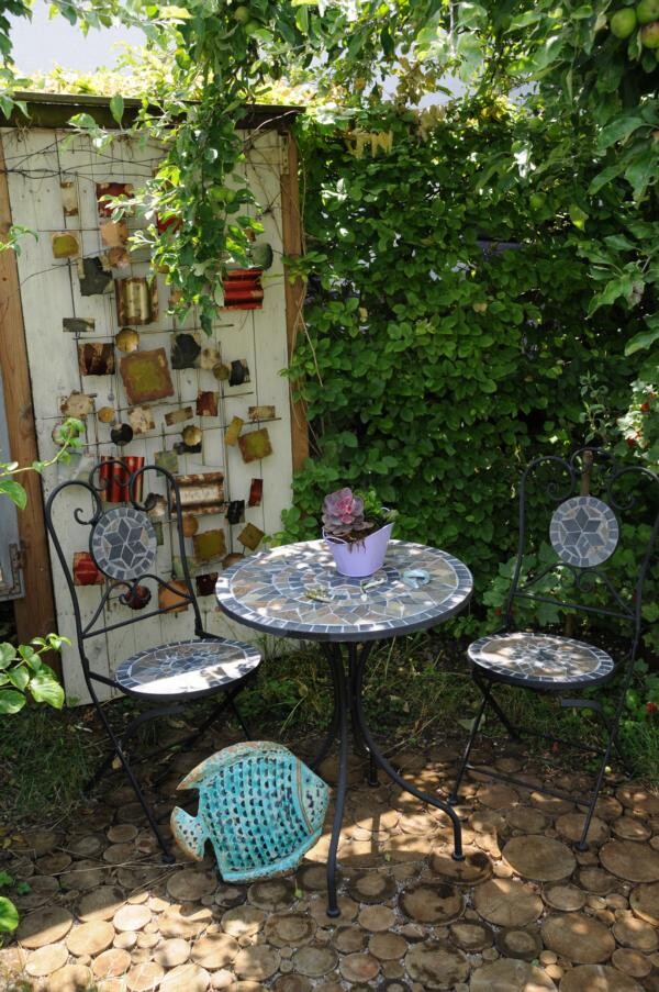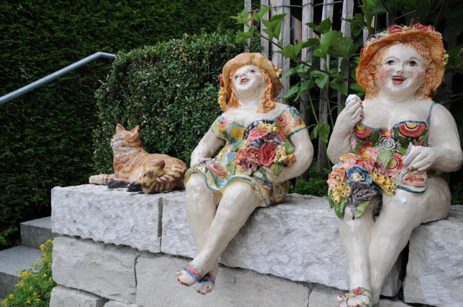 Bei Judith Koesel domieren die Kunstfiguren. Sie schafft Vögel, Menschen und viele weitere Objekte aus Keramik, die im ganzen Garten verteilt sind. Ihr Mann ist Gärtnermeister und pflegt den Hanggarten in Sigmaringen. Über mehrere Stufen reihen sich Blumen und Ausstellungsstücke aneinander, bevor der Traumgarten in einer ebenen Fläche endet. Gewächshaus und Staudengarten fügen sich gut mit einer gemütlichen Sitzecke zusammen und laden zum bleiben ein.