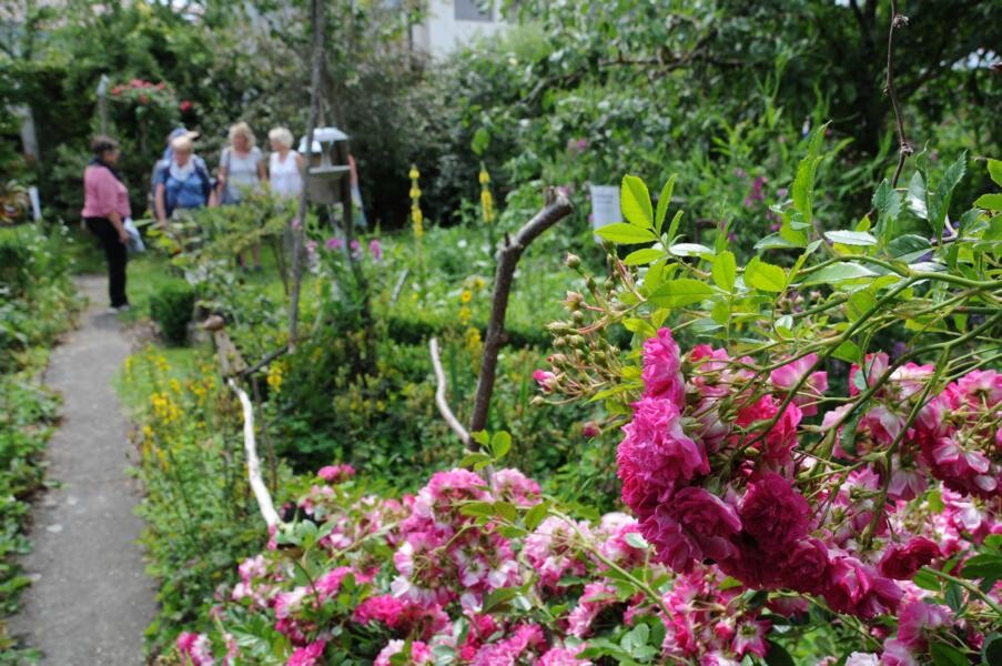 Einen kleinen Park pflegt Familie Kopf in Ebenweiler. Gut versteckt tut sich beim durchschreiten des üppigen Rosenbogens ein englischer Landhausgarten auf. Duftrosen verströmen verführerische Gerüche und blühen in üppiger Pracht. Drei Stunden verbringt der Hausherr täglich mit der Gartenpflege und hat viel Freude daran, seinen Schatz zu zeigen. Dankbar sind die Besucherinnen nach dem langen Garten-Tag über die selbstgemachte Bowle, die in solch schöner Umgebung eingenommen wird.