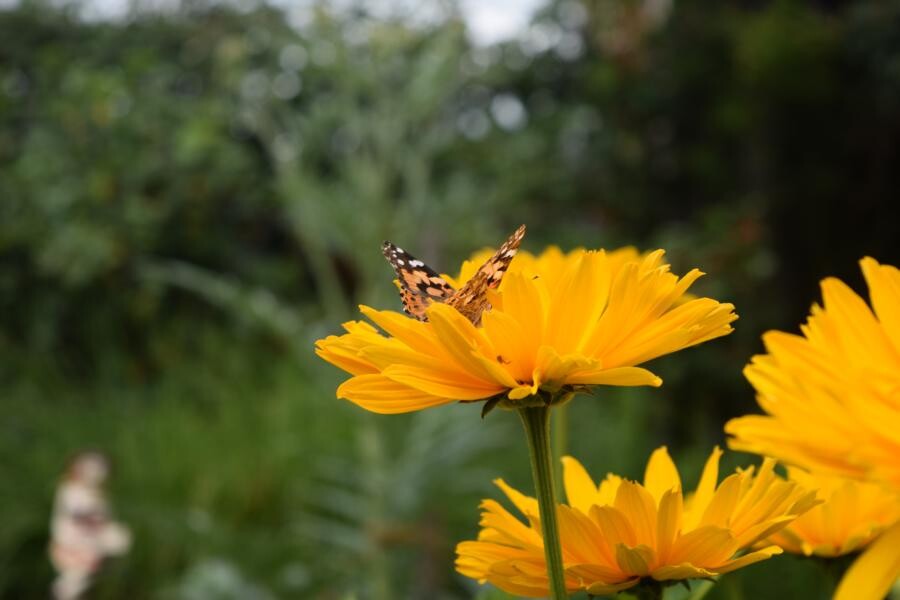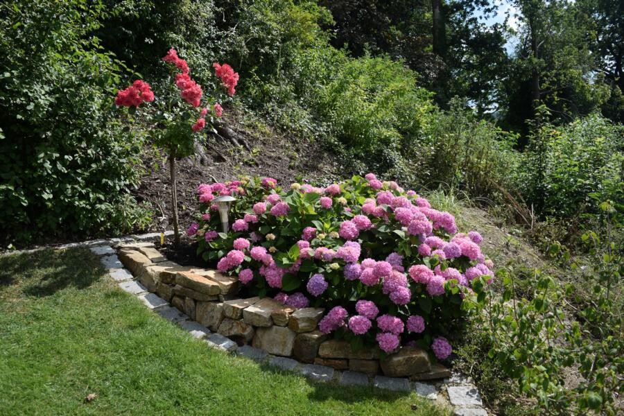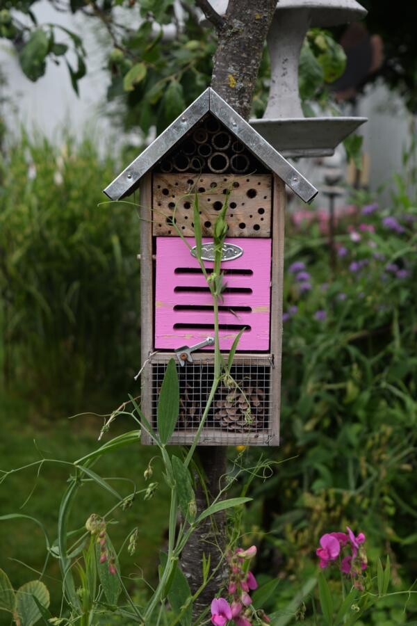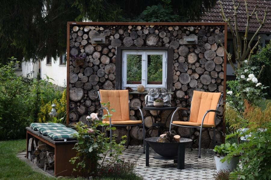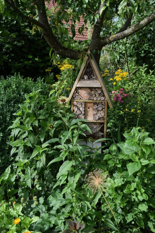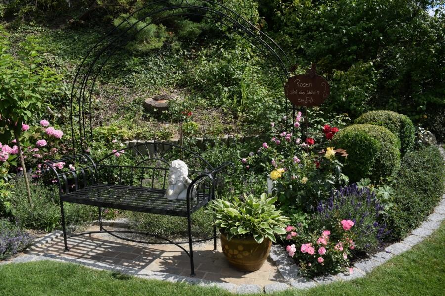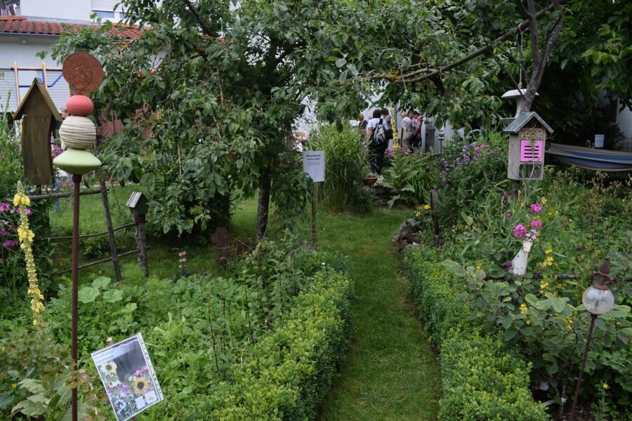 Kontrastreich dazu ist der Garten von Sigrid Wolf, der nur wenige Meter weiter zu finden ist. Die passionierte Gärtnerin hat sich zahlreiche Sitzecken geschaffen und jüngst sogar einen Bachlauf. Insektenweide für große und kleine Tiere zu sein, ist Sigrid Wolf ein wichtiges Anliegen. Zahlreiche Schmetterlinge tanzen über den duftenden Tagetes und weiteren Stauden. Auch hier finden Beerengarten und Gemüse ihren Platz. Besondere Leidenschaft sind jedoch die fein geschnittenen Buchsbüsche. Ob Kegel oder Ornamente – ein echter Hingucker.