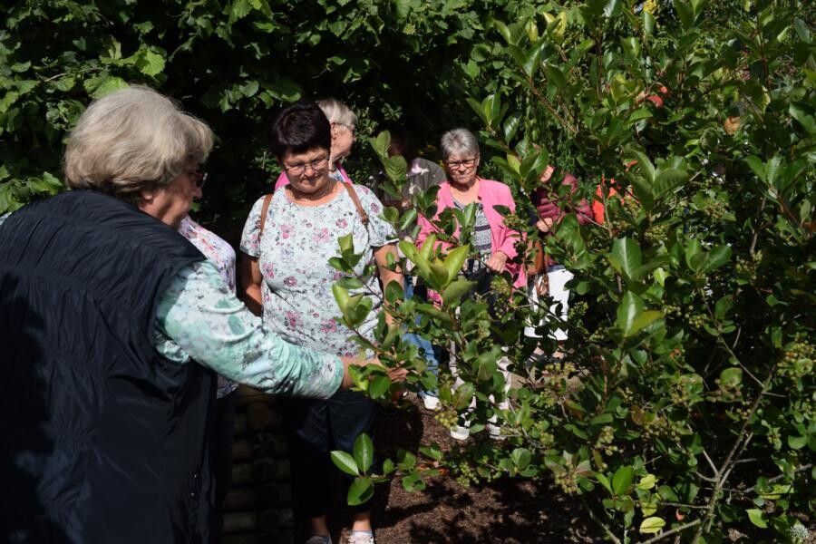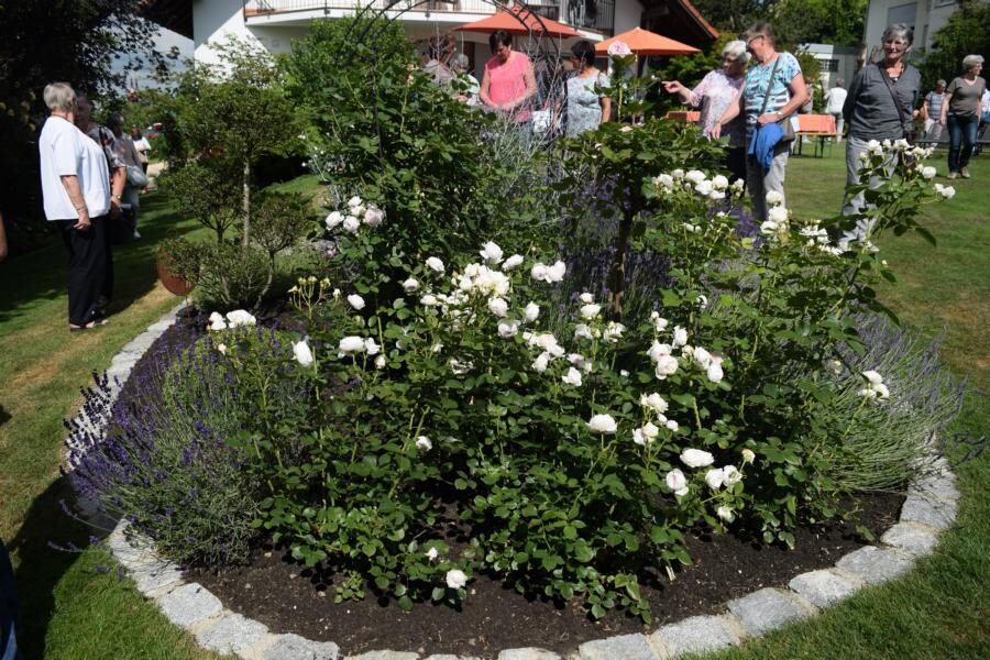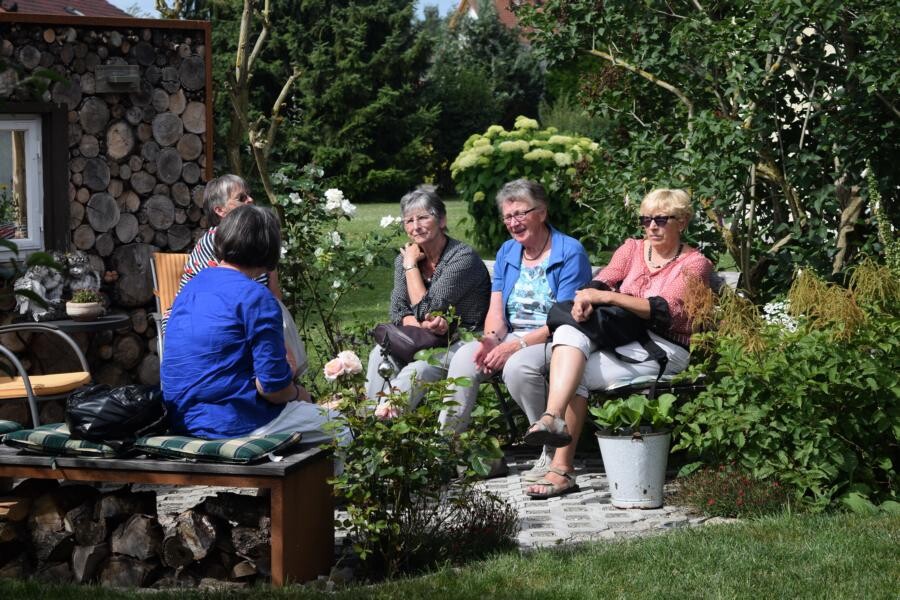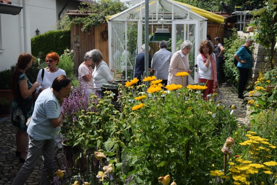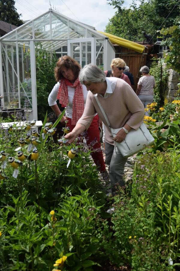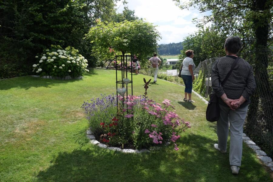 Inge Degenhardt in Sigmaringen-Laiz steht bereits wartend in der Einfahrt, als der Bus mit knapp 50 Frauen – alles begeisterte Gärtnerinnen – anrollt und lädt herzlich ein, einen Blick in ihren privaten Garten zu werfen. Es ist eine Kombination aus Nutz- und Ziergarten. Viel Leidenschaft steckt sie in Gemüsegarten und Beerensträucher. Der Teich, der lange Zeit eine schattige Ecke im Garten domierte musste vor ein paar Jahren einem Sitzplatz unter der üppigen Trauerweide weichen. An dem heißen Sommertag ein begehrter Platz der Gartenfahrten-Teilnehmerinnen.