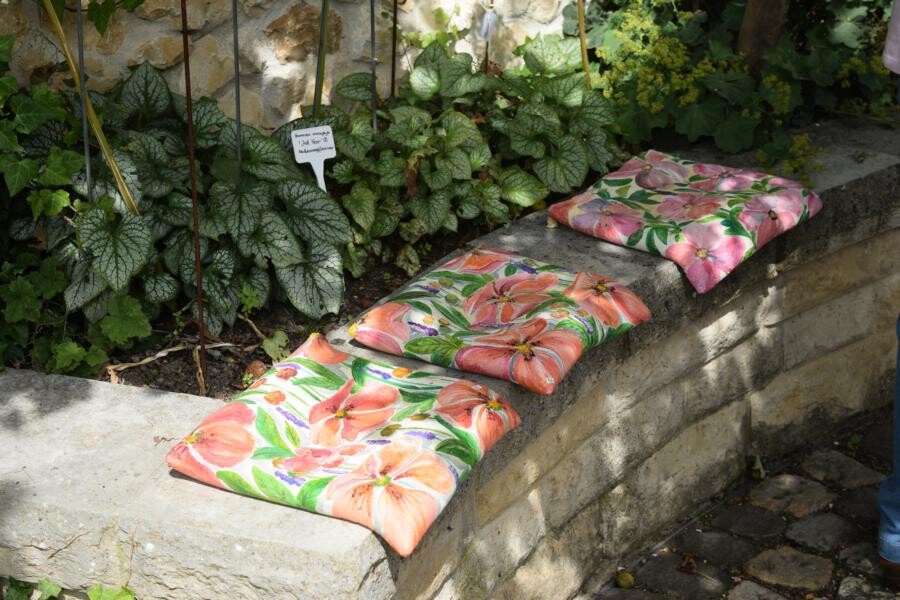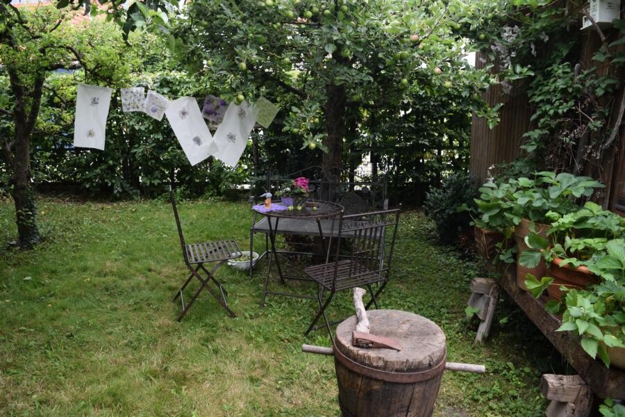 Eine wahre Idylle haben sich auch Petra und Gerhard Knaus geschaffen. Das alte Bauernhaus wurde zum Wohnhaus umgaubt, das Grundstück zum Wohlfühlgarten. Hohe Bäume spenden Schatten und Blumen aller Art dürfen wachsen. Gerhard Knaus sagt selbst, dass wachsen darf, was will, wobei die regelmäßige Pflege unverkennbar ist. Hier eine Wildblumenmischung, dort die Tomaten, die vom vergangenen Jahr wieder aussamen. Es gibt Hingucker an jeder Ecke. Wunderschön ergänzt durch die zahlreichen Patchwork-Arbeiten der Hausherrin. Und in der Hängematte der Kinder ruht sich auch gern die ein oder andere Teilnehmerin aus.