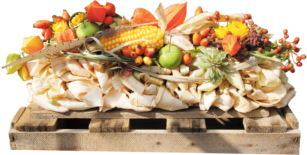 Das längliche Gesteck, auch Fries genannt, ist eine etwas andere Herbstdekoration und ist ein Schmuck für jeden Wohnraum. Benötigt werden: Trockensteckmasse, Wickeldraht, Heißklebepistole, Pappe und Herbstfrüchte. Zur Herstellung der Unterlage wird ein Trockensteckschwamm der Länge nach geteilt. Je nachdem, wie lang das Gesteck werden soll, verwendet man nur eine Hälfte oder klebt den zweiten Teil daneben. Da der Schwamm leicht bröselt, schneidet man sich aus Pappe in der passenden Länge eine Unterlage zu und klebt diese an den Boden. Nun werden die Maisblätterschleifenbündel, wie bereits beim Kranz beschrieben in größerer Menge vorbereitet. Am Boden angefangen, werden sie rund um den Schwamm mit der Klebepistole befestigt. Abhängig von...